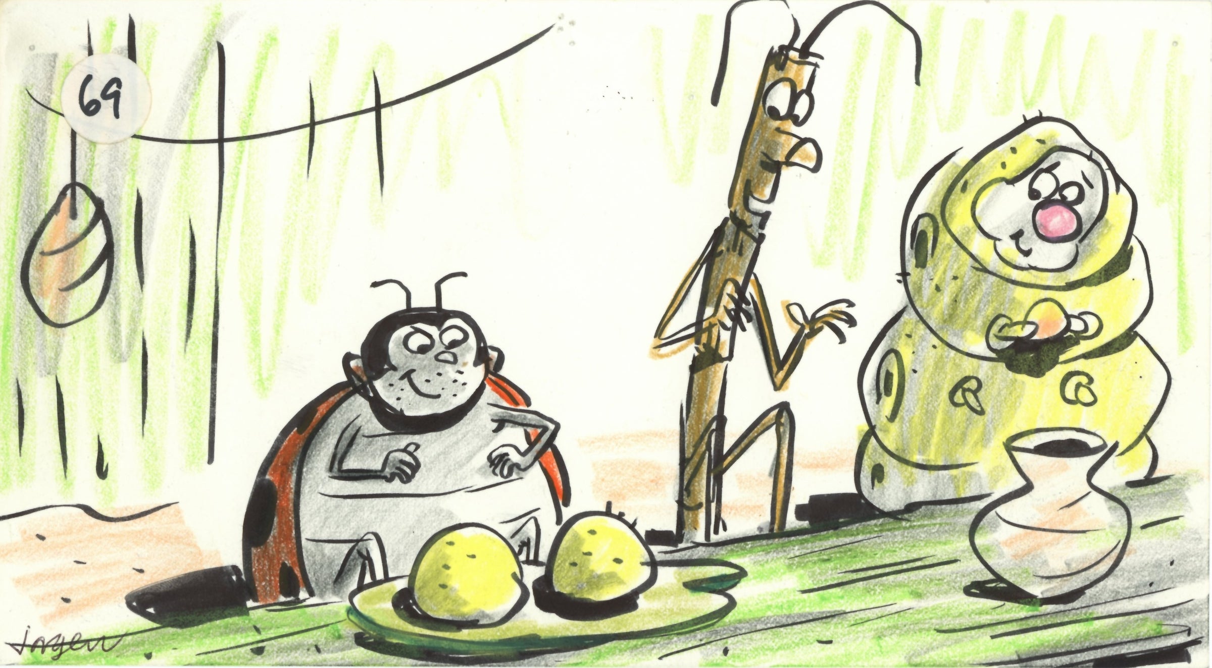 ABOUT THE ART AND ARTIST: Presented here is a wonderful original storyboard from Disney storyman Jorgen Klubien. Klubien is an animation artist and writer best known for his work on Disney films, like The Lion King (1994), A Bug's Life (1998), Cars (2006) and Frankenweenie (2012). The boards were rendered with pen and colored pencil on 10" x 5.5" paper. This piece is signed by the artist, Jorgen Klubien in the bottom right.