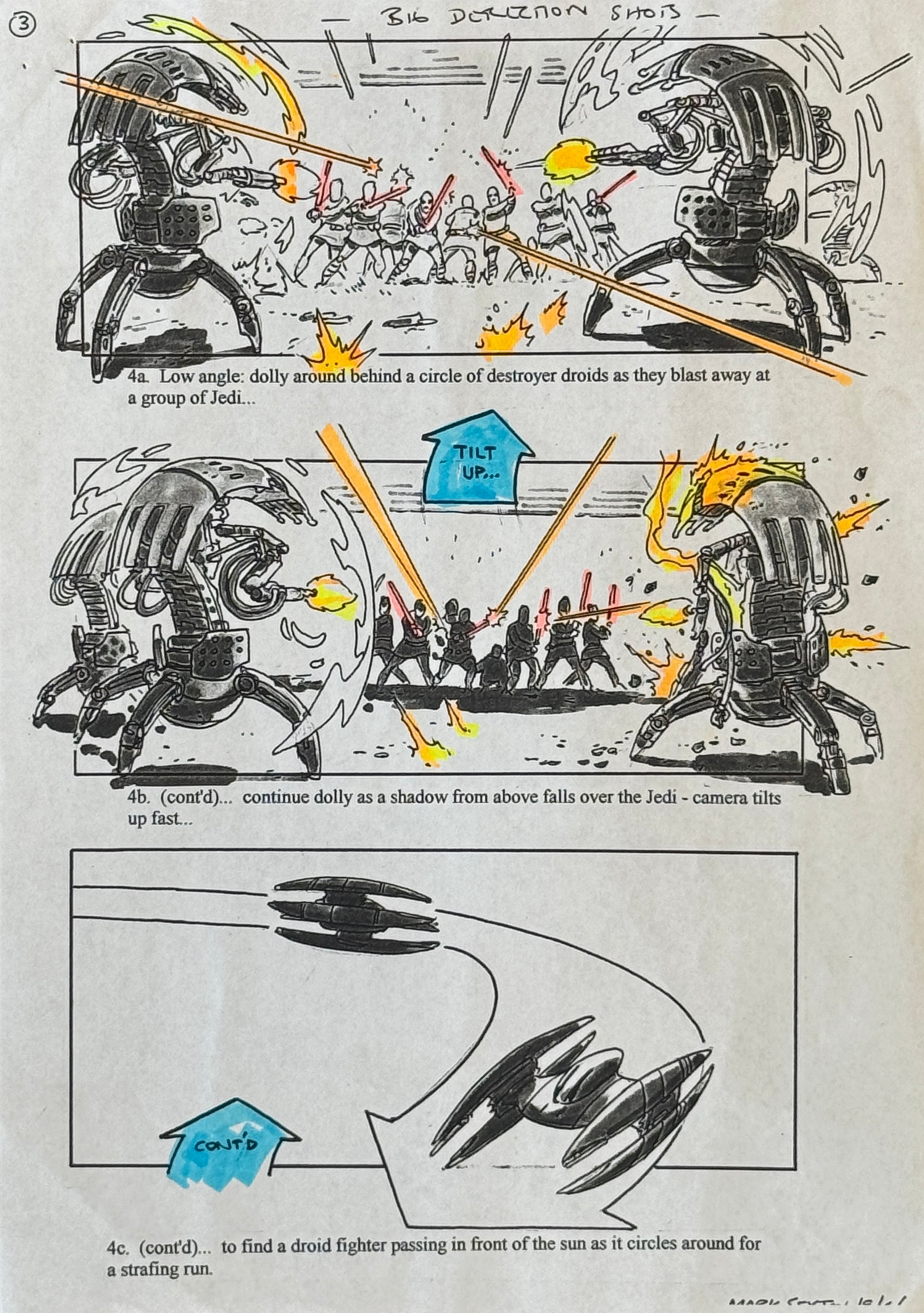 ABOUT THE ARTWORK: This hand-colored photostat storyboard was used during the production of Star Wars: Episode II - Attack of the Clones. This amazing storyboard sequence comes from the personal collection of stunt coordinator Nick Gillard. Nick Gillard is an English stuntman and stunt coordinator. He is best known as the lead lightsaber fight and stunt coordinator of the Star Wars prequel trilogy films (1999–2005).
