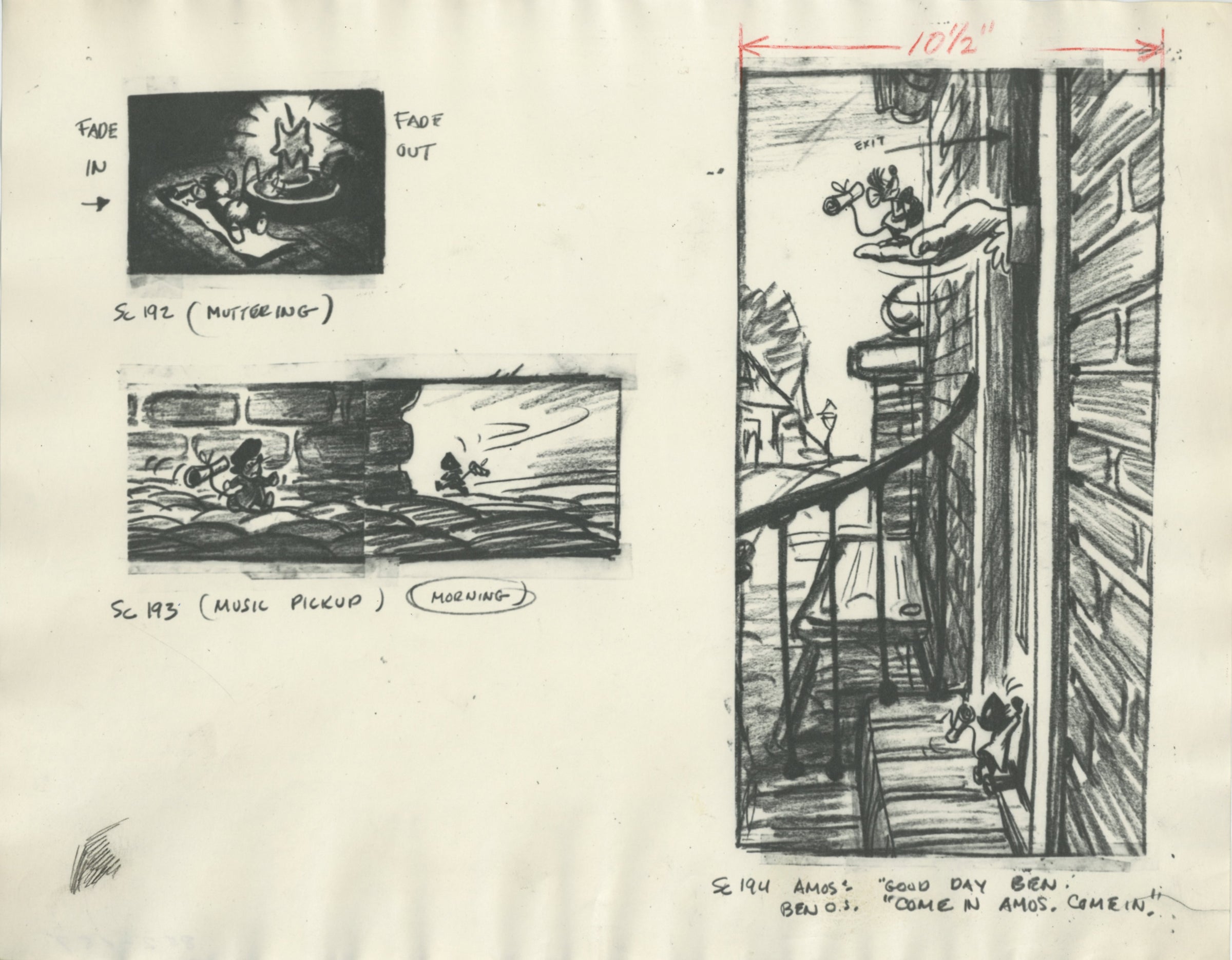 ABOUT THE MEDIUM: Storyboard Drawings show what’s moving in each shot, and in which direction, so that the production team is crystal clear on the desired end result. Photostat Storyboard Sheets are printed copies of the original storyboard drawings that were used by staff during the production of a film.
