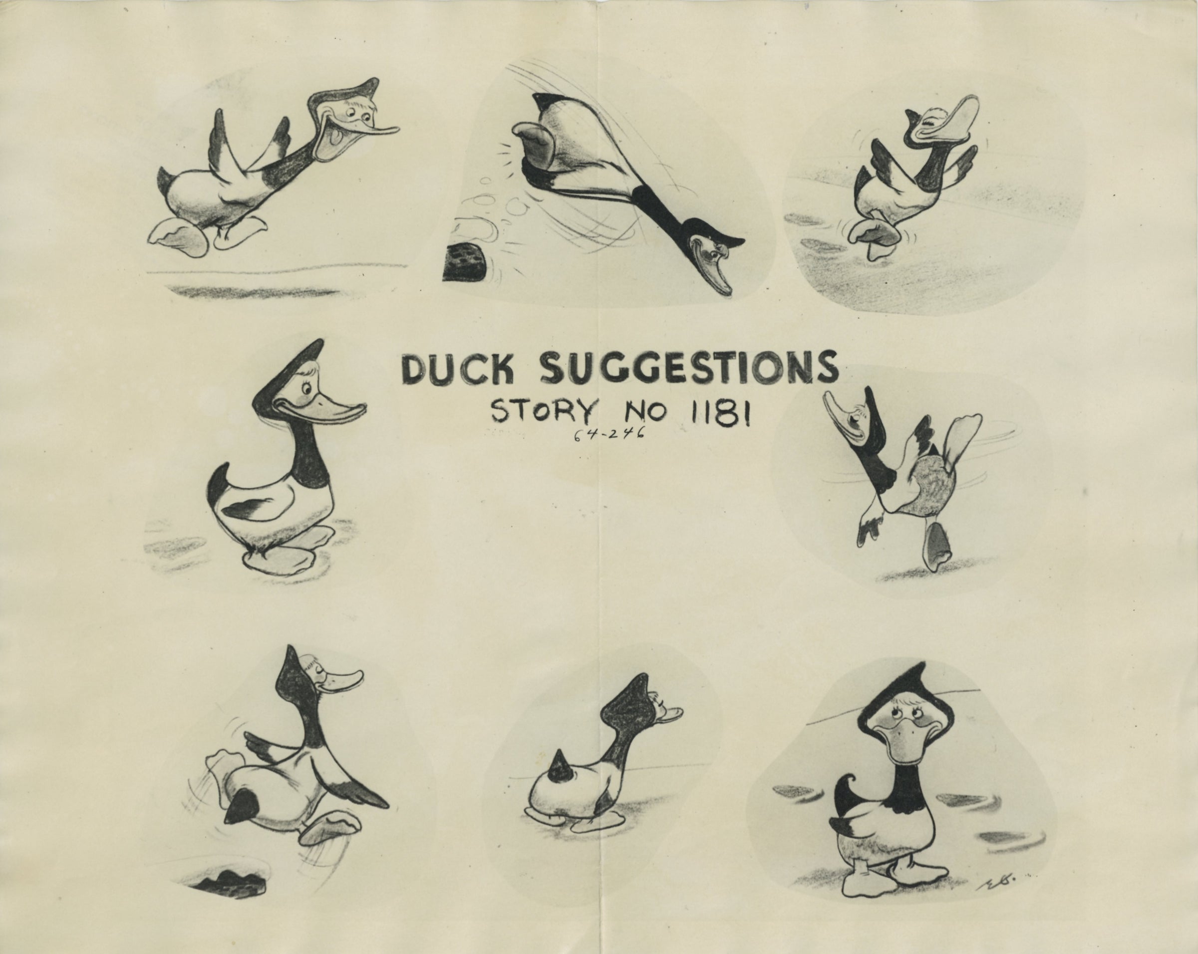 ABOUT THE MEDIUM: Photostat Model Sheets are reference guides used by animators to ensure consistency in character design, proportions, and expressions throughout a film. These printed sheets typically feature multiple poses, facial expressions, and turnarounds of a character, often photocopied from finalized drawings by lead animators. Model sheets help maintain uniformity in animation by providing a standard reference for all artists working on a character, preventing visual discrepancies between different scenes.
