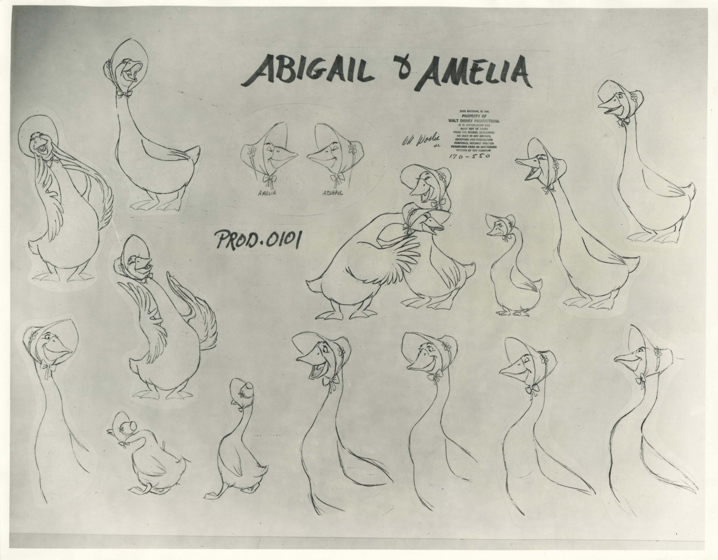 ABOUT THE IMAGE: This photostat model sheet titled "Abigail & Amelia" was made at Disney Studio during production of The Aristocats (1970), and it was issued to animators for their use in drawing the two geese. A note written by the film's director Wolfgang Reitherman reading, "OK Woolie," has been reproduced below the title.