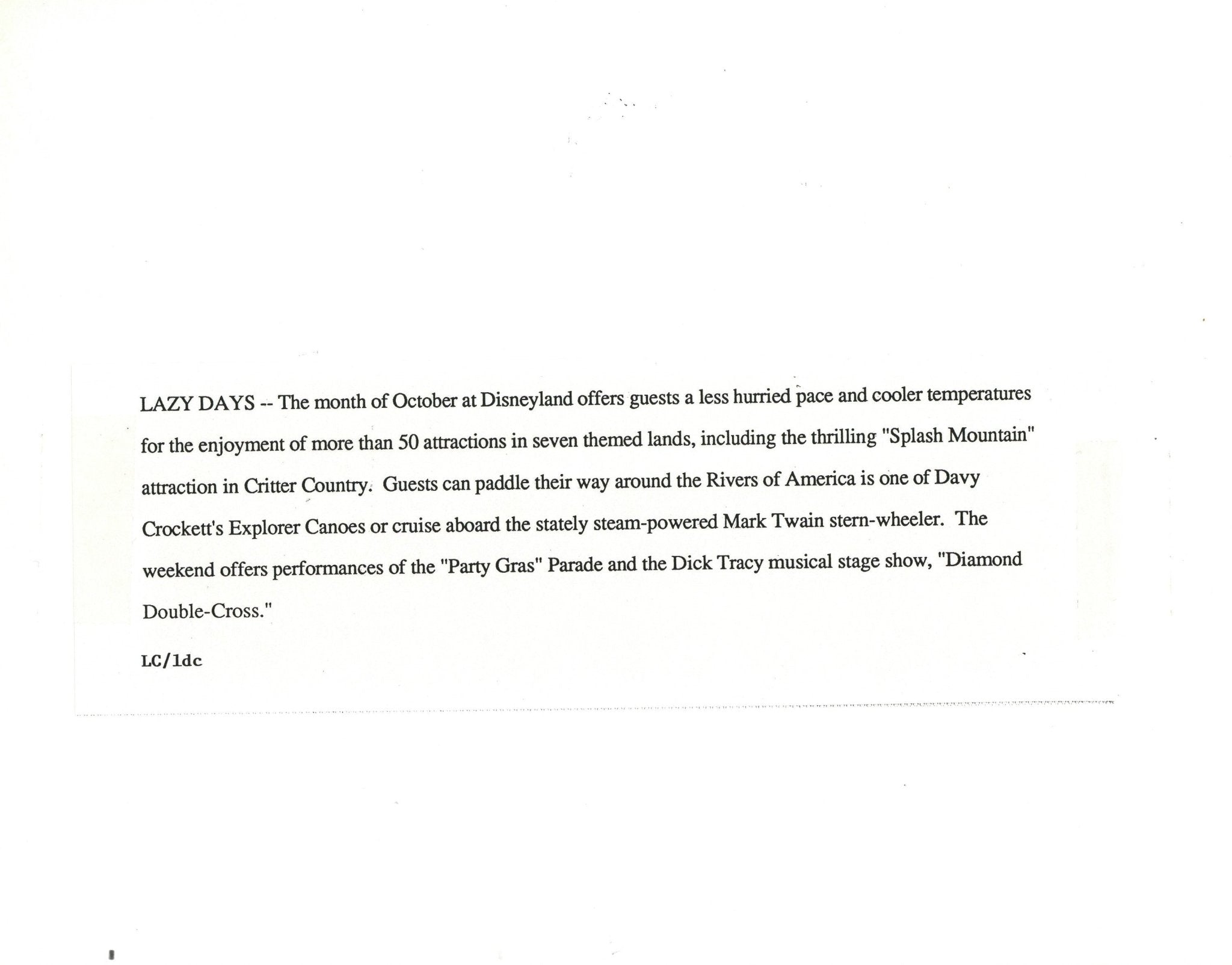 ABOUT THE IMAGE: "LAZY DAYS -- The month of October at Disneyland offers guests a less hurried pace and cooler temperatures for the enjoyment of more than 50 attractions in seven themed lands, including the thrilling "Splash Mountain" attraction in Critter Country. Guests can paddle their way around the Rivers of America is one of Davy Crockett's Explorer Canoes or cruise aboard the stately steam-powered Mark Twain stern-wheeler. The weekend offers performances of the "Party Gras" Parade and the Dick Tracy musical stage show, "Diamond Double-Cross."