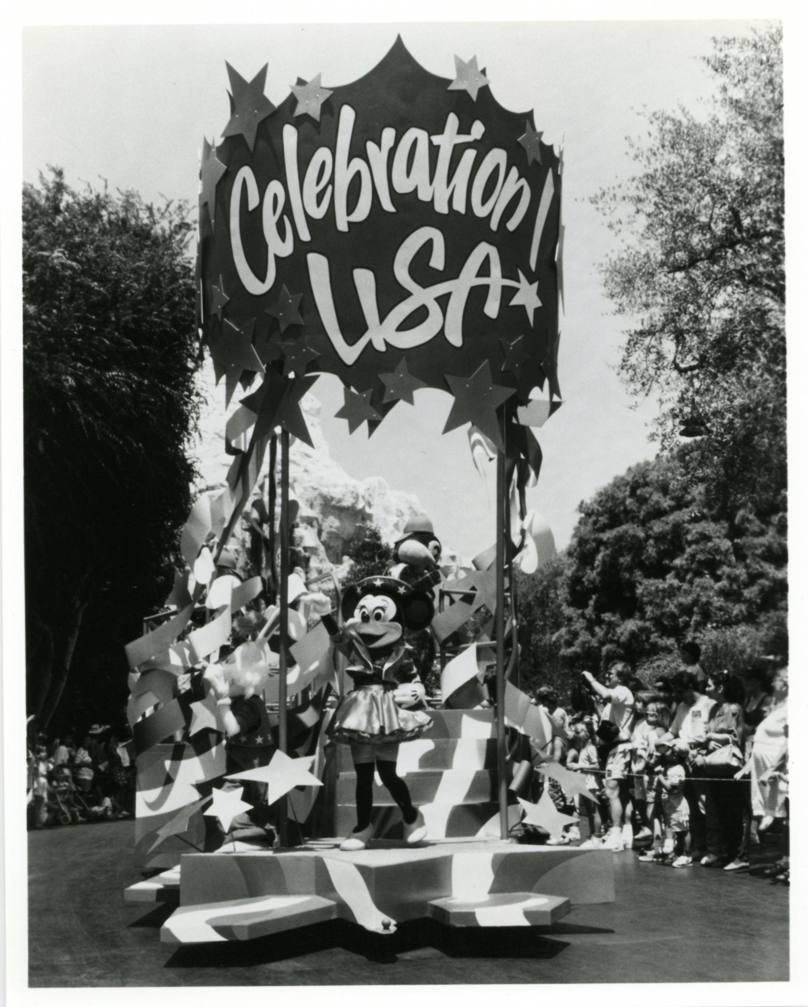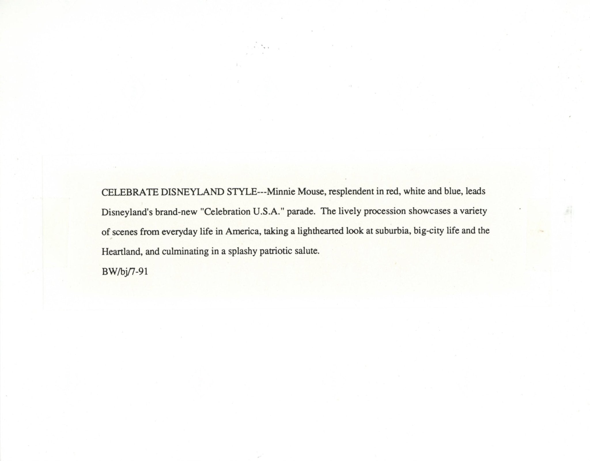 ABOUT THE IMAGE: "CELEBRATE DISNEYLAND STYLE---Minnie Mouse, resplendent in red, white and blue, leads Disneyland's brand-new "Celebration U.S.A." parade. The lively procession showcases a variety of scenes from everyday life in America, taking a lighthearted look at suburbia, big-city life and the Heartland, and culminating in a splashy patriotic salute."