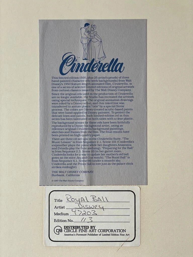 The background scenes for these cels have been faithfully reproduced by a Disney background artist, using as reference original Cinderella background paintings, sketches, and frames from the film. The final results have been printed on high-quality paper. This piece comes with the original certificate of authenticity.