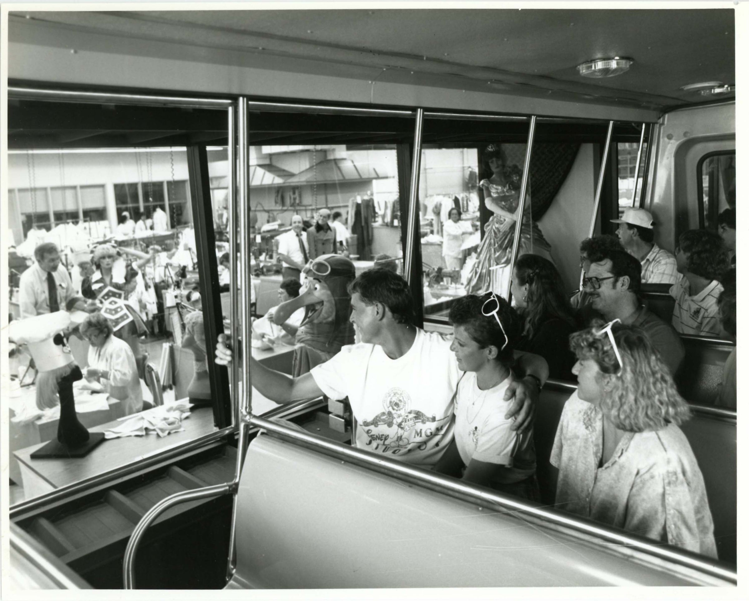 ABOUT THE IMAGE: "TRAM WITH A VIEW -- Guests taking the Backstage Studio Tour at the new Disney-MGM Studios Theme Park will get a look at designers, seamstresses and tailors in the Walt Disney World Creative Costuming Department. The tram will stop in front of windows which front the entire 18,000-square-foot department, and a tour guide will explain a bit of the costume-making process."