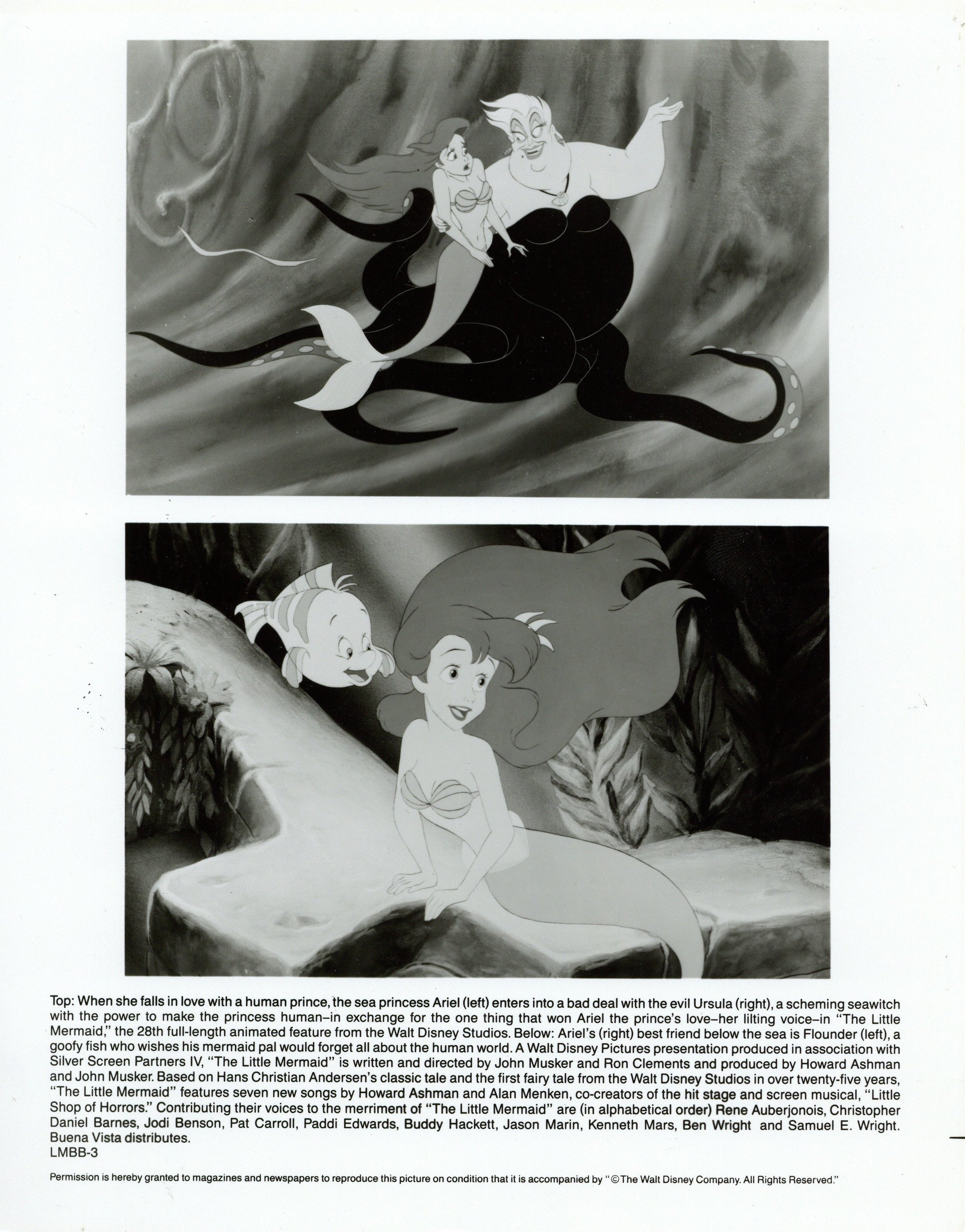Below: Ariel's (right) best friend below the sea is Flounder (left), a goofy fish who wishes his mermaid pal would forget all about the human world. A Walt Disney Pictures presentation produced in association with Silver Screen Partners IV, "The Little Mermaid" is written and directed by John Musker and Ron Clements and produced by Howard Ashman and John Musker. Based on Hans Christian Andersen's classic tale and the first fairy tale from the Walt Disney Studios in over twenty-five years.