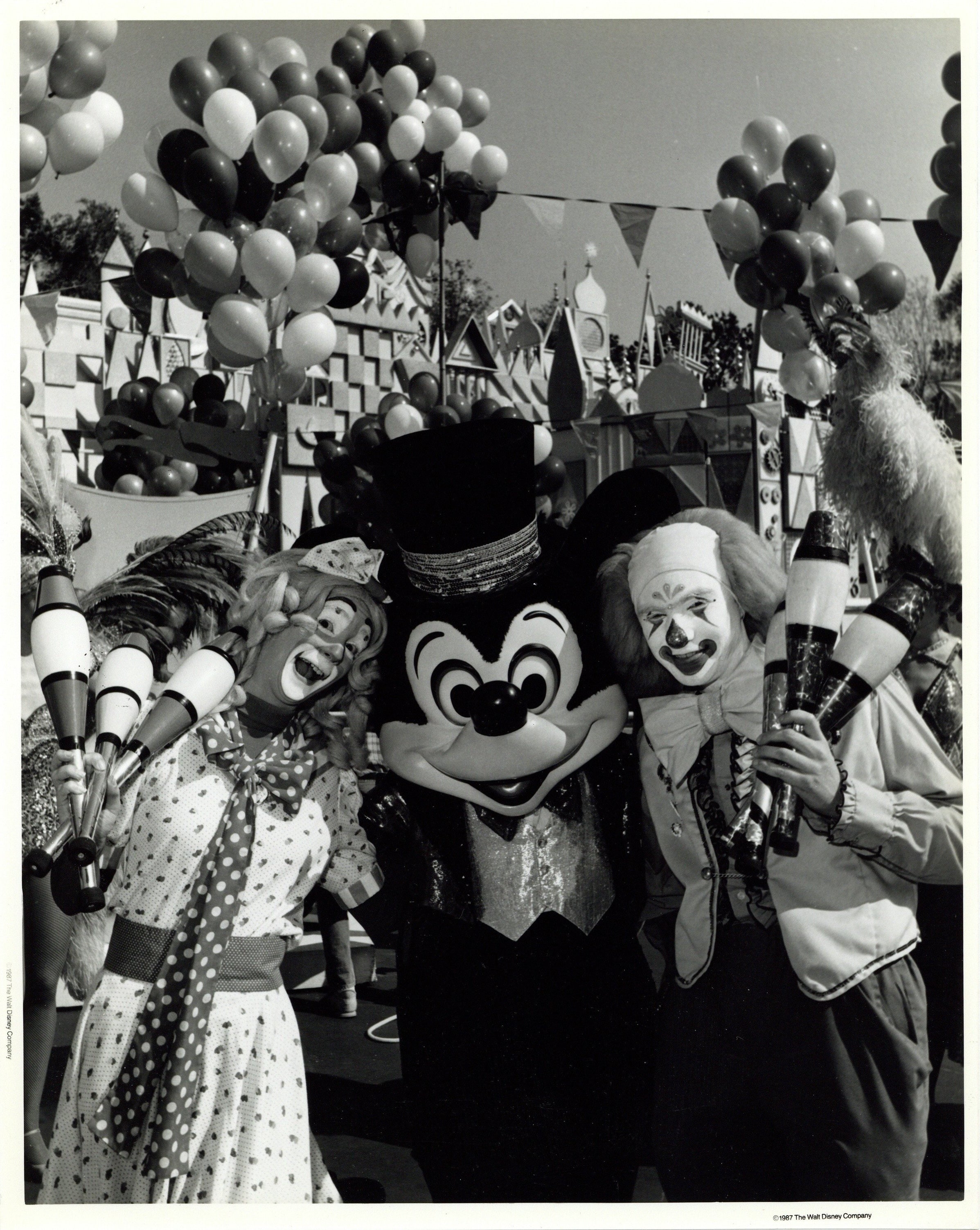 ABOUT THE IMAGE: "CLOWNING AROUND---Ringmaster Mickey Mouse is joined by two friends for some Circus Fantasy '88 fun in front of "It's a Small World" at Disneyland. Circus Fantasy '88 will continue January 16 through March 6 at the Anaheim theme park, with daily parades, shows and special circus acts throughout the Magic Kingdom."