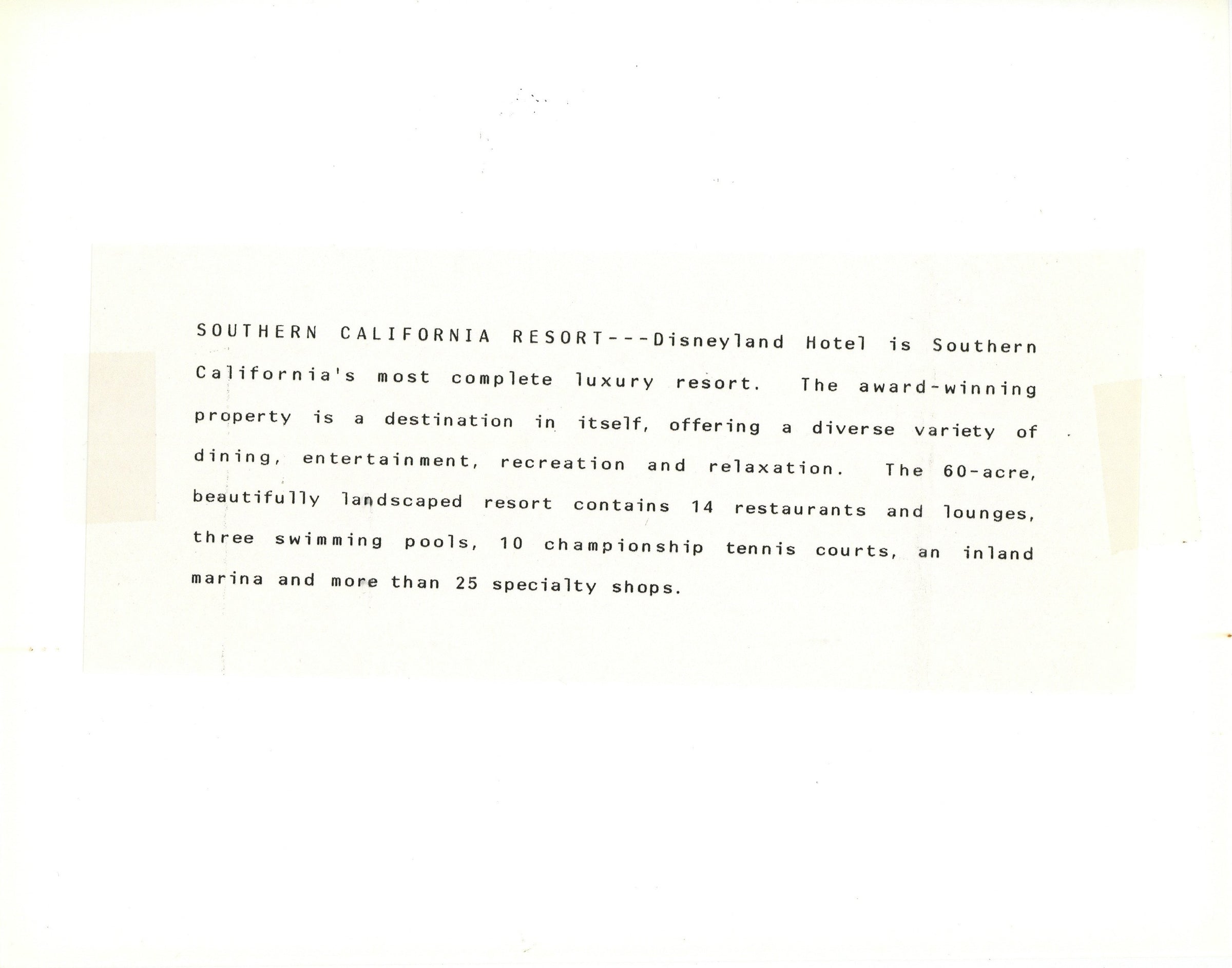 ABOUT THE IMAGE: "SOUTHERN CALIFORNIA RESORT---Disneyland Hotel is Southern California's most complete luxury resort. The award-winning property is a destination in itself, offering a diverse variety of dining, entertainment, recreation and relaxation. The 60-acre, beautifully landscaped resort contains 14 restaurants and lounges, three swimming pools, 10 championship tennis courts, an inland marina and more than 25 specialty shops."