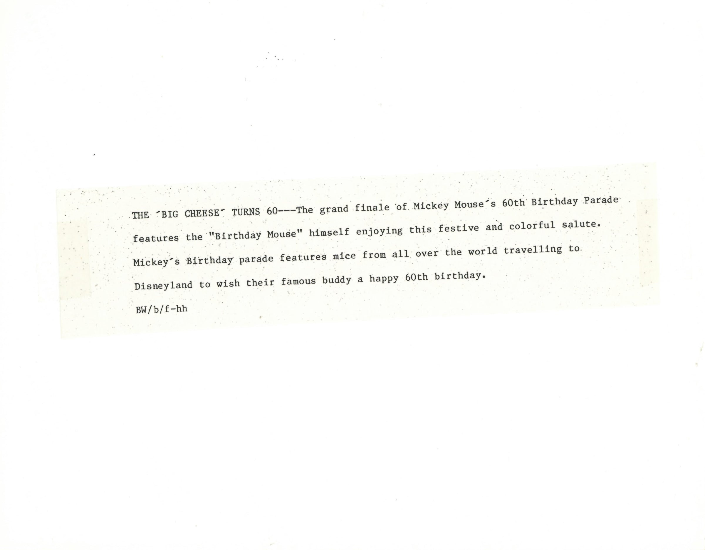 ABOUT THE IMAGE: "THE 'BIG CHEESE TURNS 60---The grand finale of Mickey Mouse's 60th Birthday Parade features the "Birthday Mouse" himself enjoying this festive and colorful salute. Mickey's Birthday parade features mice from all over the world traveling to. Disneyland to wish their famous buddy a happy 60th birthday."
