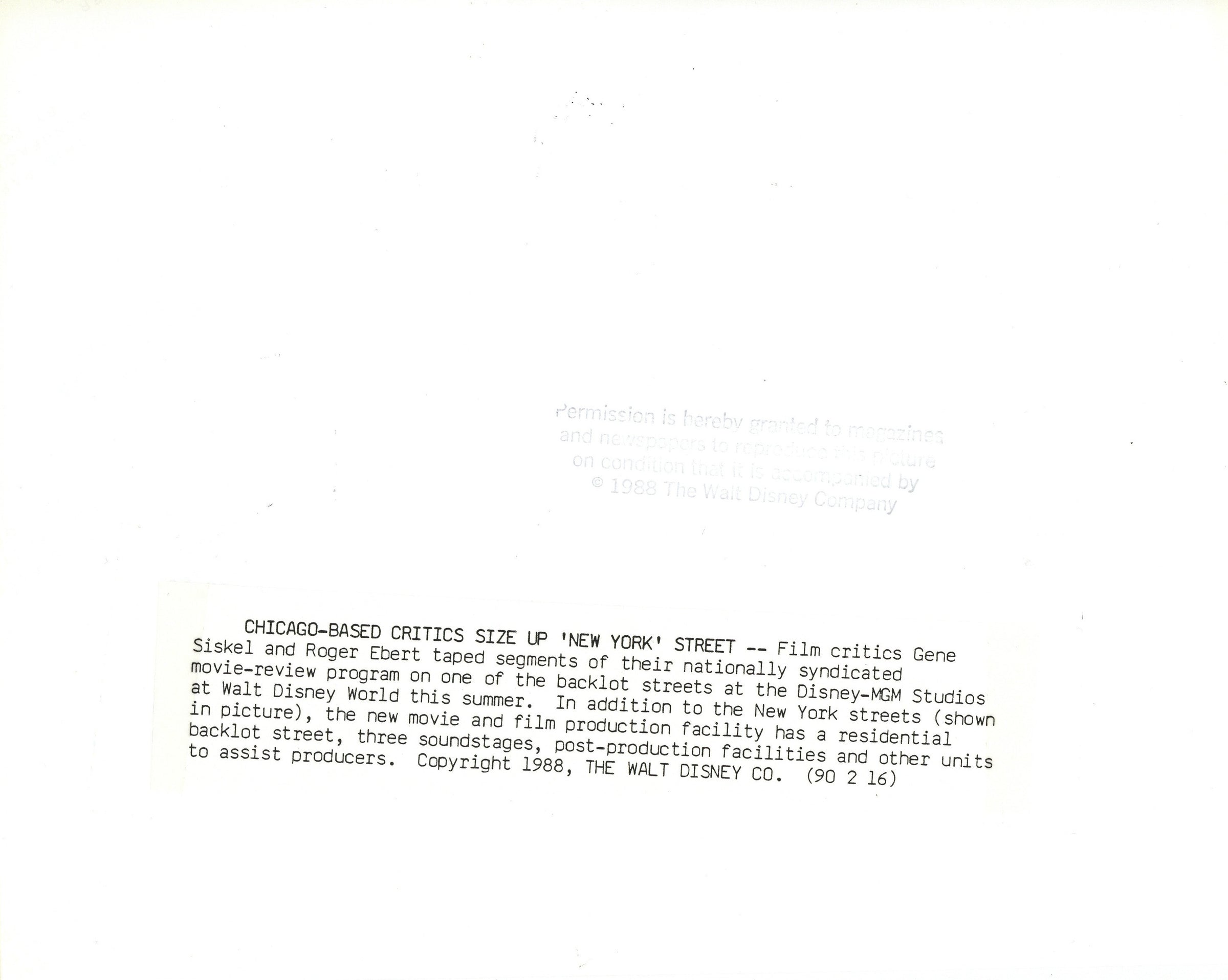 ABOUT THE IMAGE: "CHICAGO-BASED CRITICS SIZE UP 'NEW YORK' STREET -- Film critics Gene Siskel and Roger Ebert taped segments of their nationally syndicated movie-review program on one of the backlot streets at the Disney-MGM Studios at Walt Disney World this summer. In addition to the New York streets (shown in picture), the new movie and film production facility has a residential backlot street, three soundstages, post-production facilities and other units to assist producers."