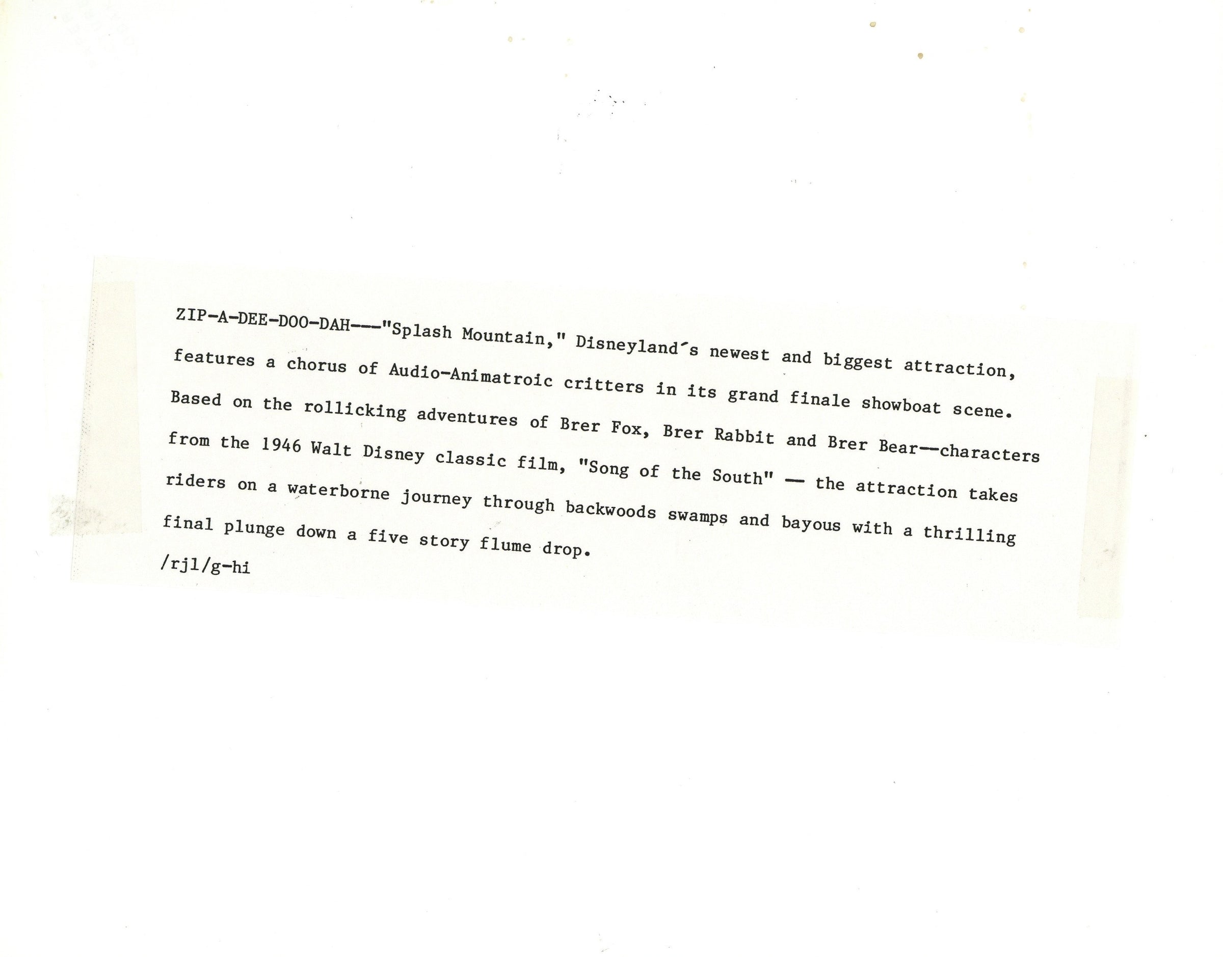 ABOUT THE IMAGE: "ZIP-A-DEE-DOO-DAH-"Splash Mountain," Disneyland's newest and biggest attraction, features a chorus of Audio-Animatroic critters in its grand finale showboat scene. Based on the rollicking adventures of Brer Fox, Brer Rabbit and Brer Bear-characters from the 1946 Walt Disney classic film, "Song of the South" — the attraction takes riders on a waterborne journey through backwoods swamps and bayous with a thrilling final plunge down a five story flume drop."