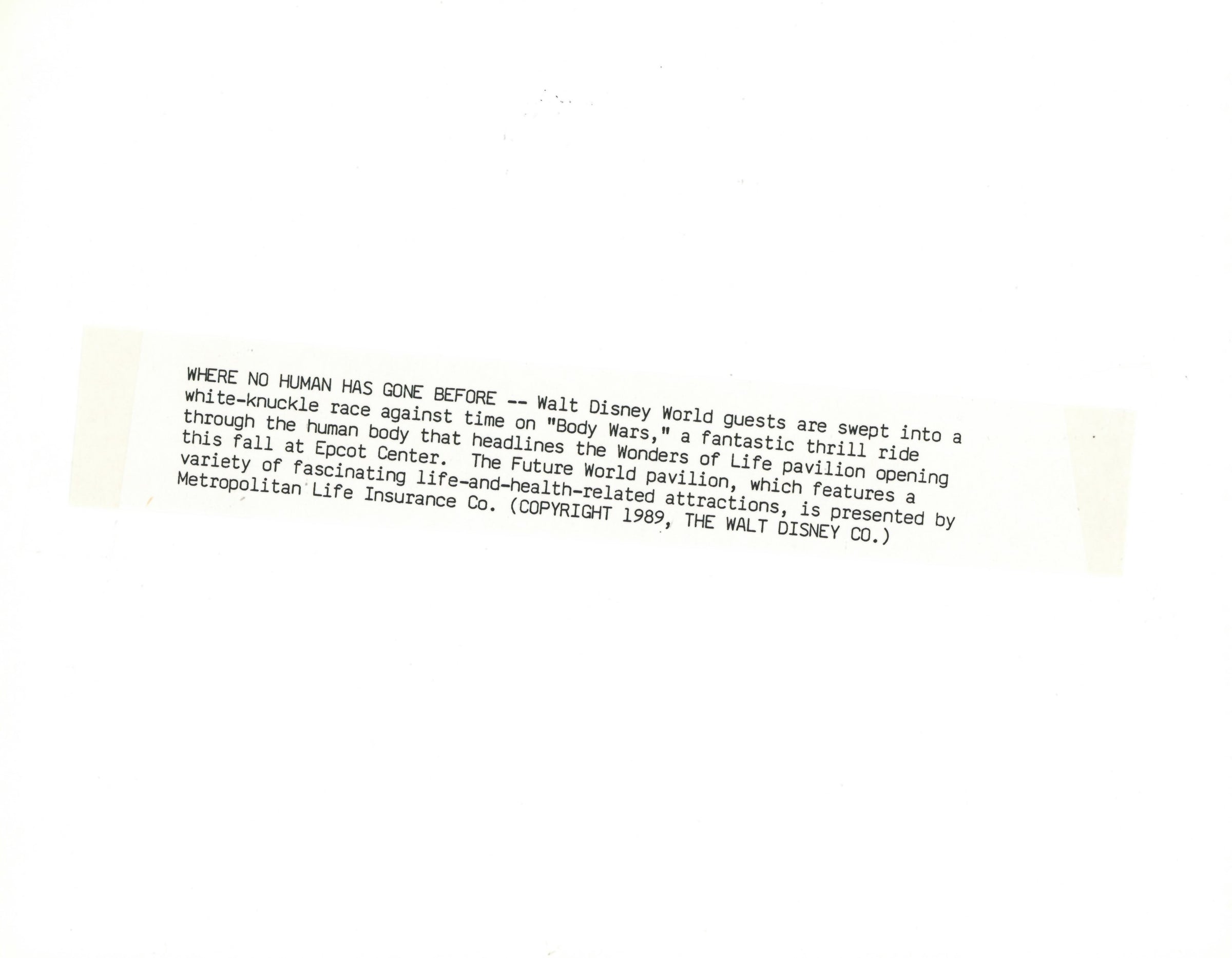 ABOUT THE IMAGE: "WHERE NO HUMAN HAS GONE BEFORE -- Walt Disney World guests are swept into a white-knuckle race against time on "Body Wars," a fantastic thrill ride through the human body that headlines the Wonders of Life pavilion opening this fall at Epcot Center. The Future World pavilion, which features a variety of fascinating life-and-health-related attractions, is presented by Metropolitan Life Insurance Co."