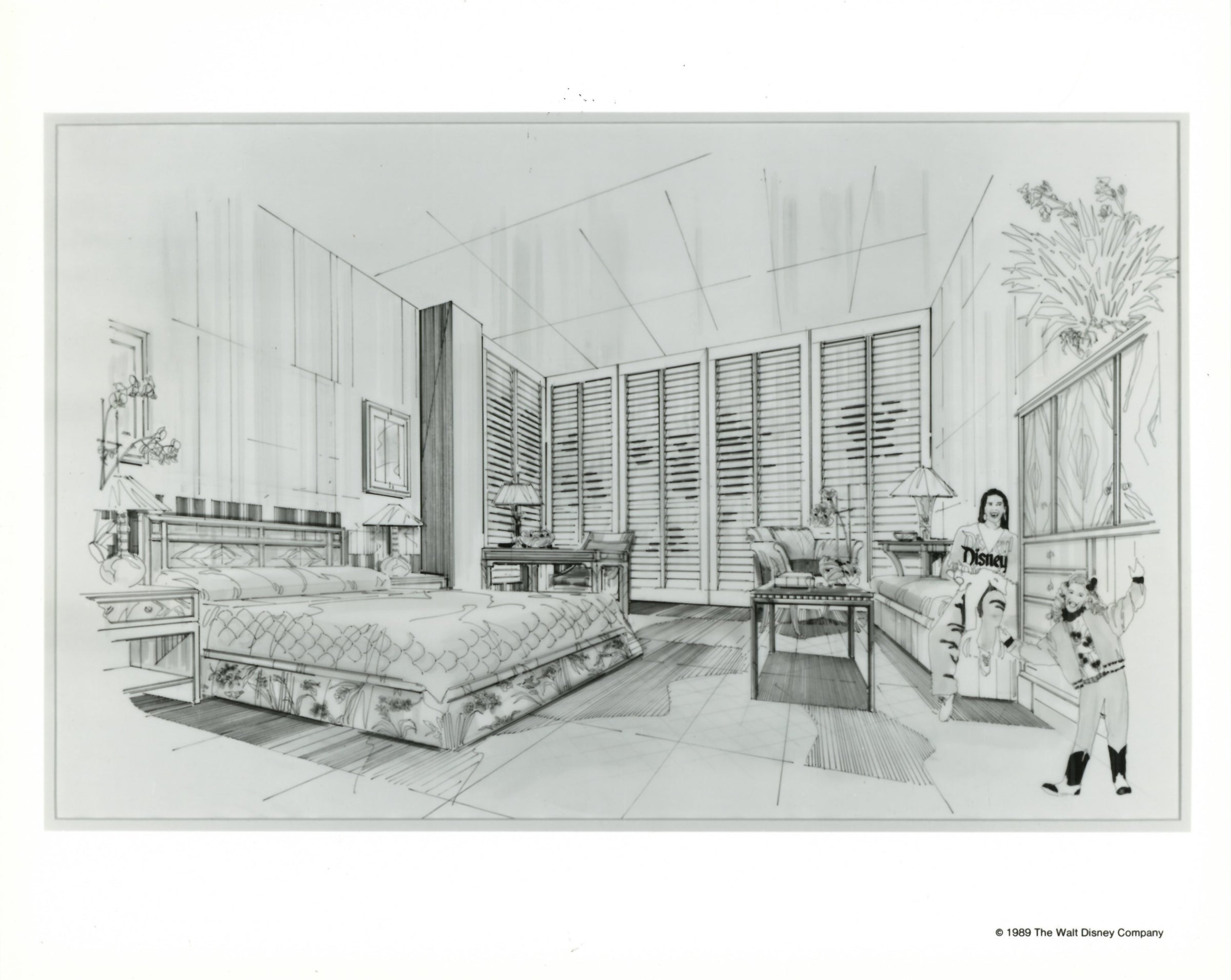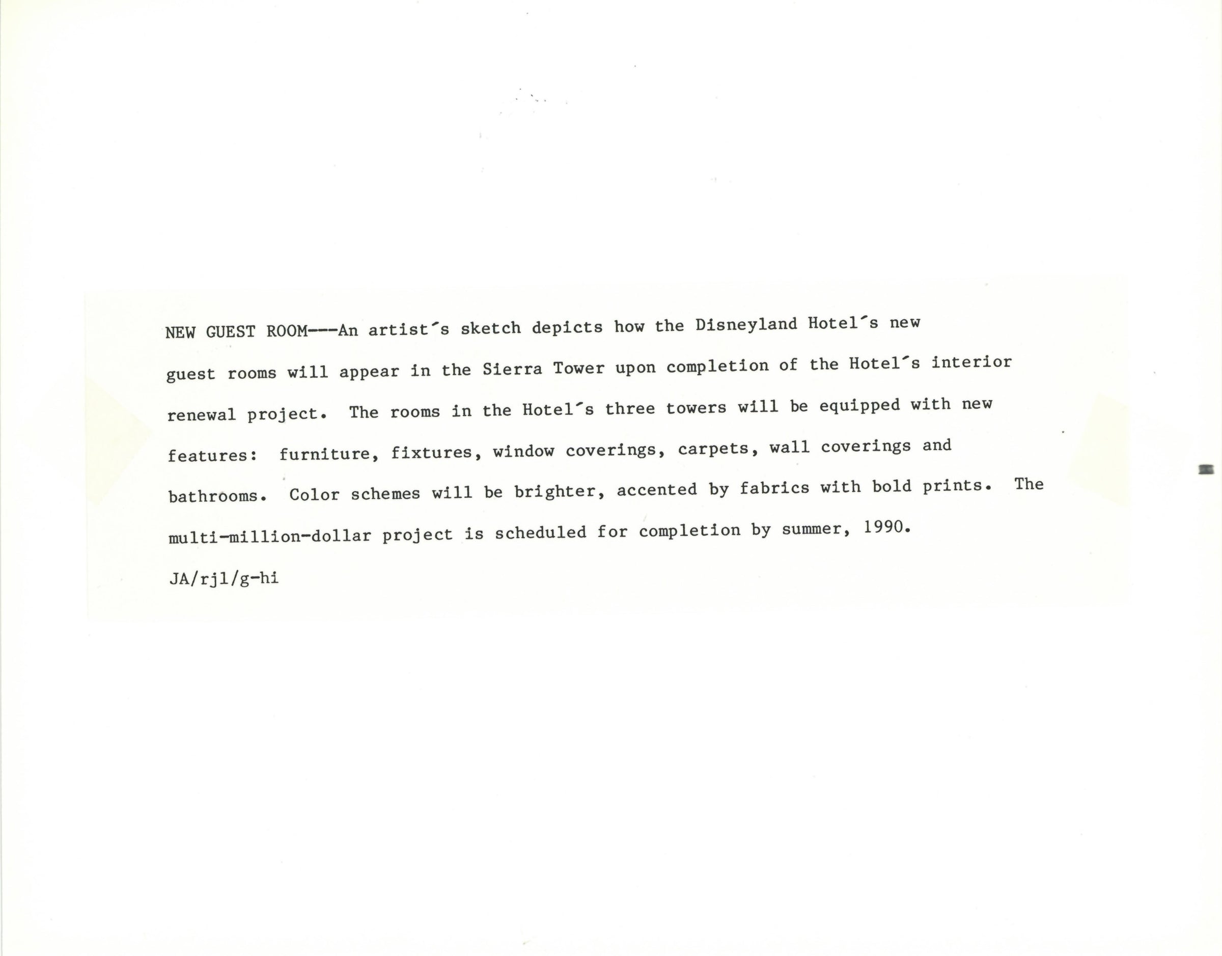 ABOUT THE IMAGE: "NEW GUEST ROOM--An artist's sketch depicts how the Disneyland Hotel's new guest rooms will appear in the Sierra Tower upon completion of the Hotel's interior renewal project. The rooms in the Hotel's three towers will be equipped with new features: furniture, fixtures, window coverings, carpets, wall coverings and bathrooms. Color schemes will be brighter, accented by fabrics with bold prints. The multi-million-dollar project is scheduled for completion by summer, 1990."