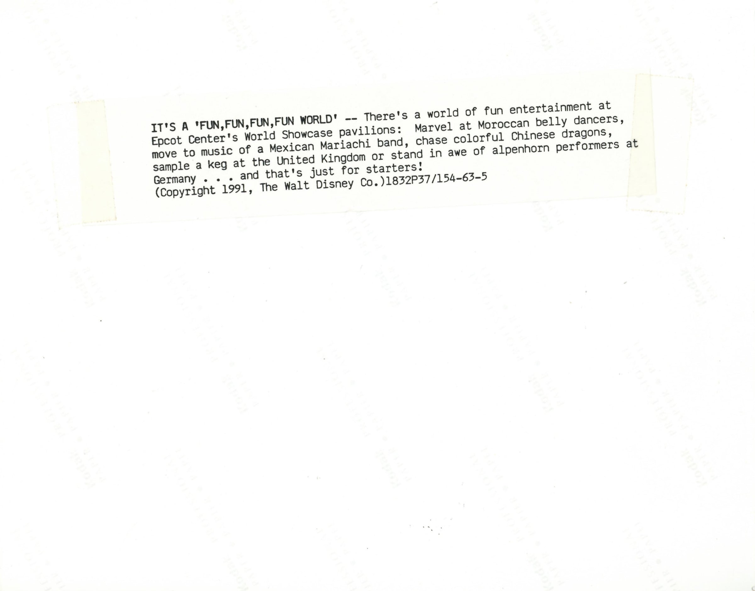 ABOUT THE IMAGE: "IT'S A 'FUN, FUN, FUN, FUN WORLD' -- There's a world of fun entertainment at Epcot Center's World Showcase pavilions: Marvel at Moroccan belly dancers, move to music of a Mexican Mariachi band, chase colorful Chinese dragons, sample a keg at the United Kingdom or stand in awe of alpenhorn performers at Germany... and that's just for starters!"