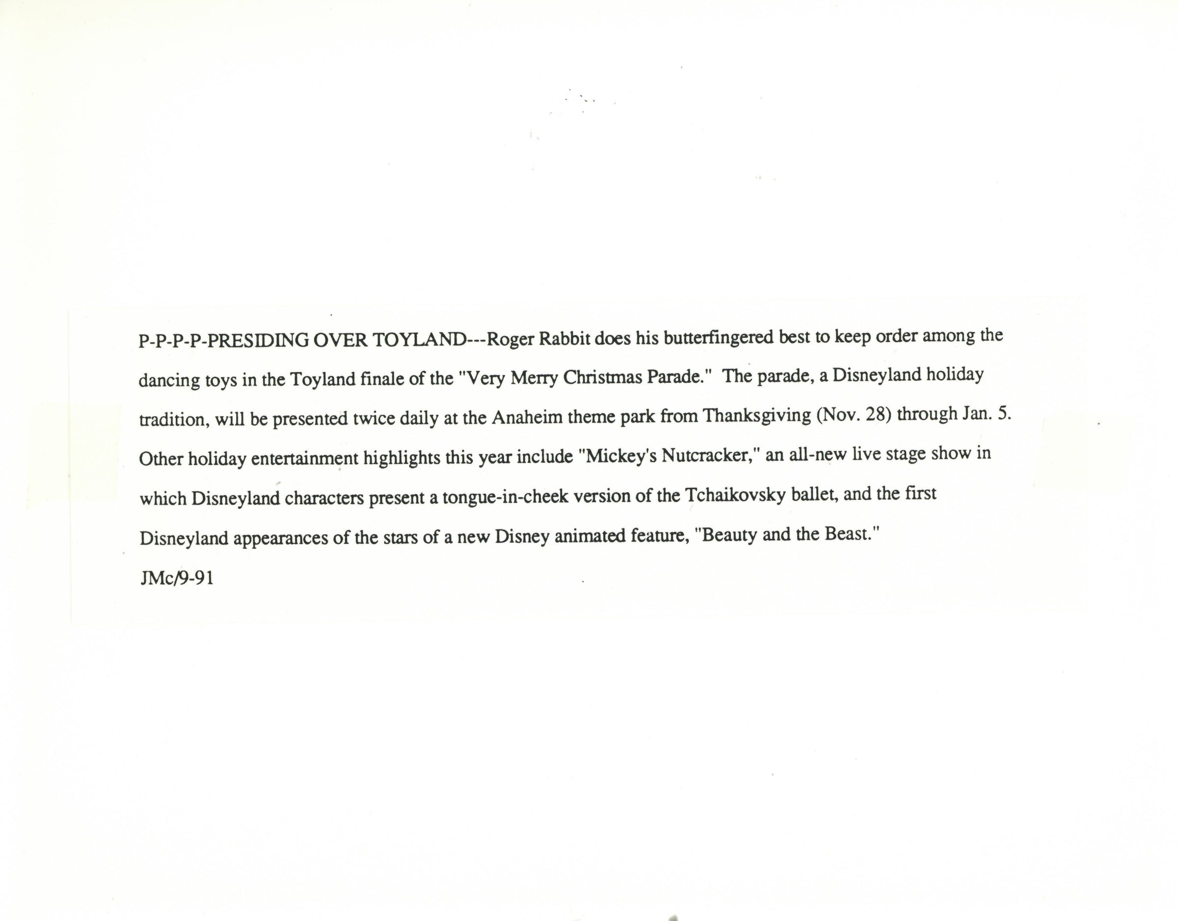 ABOUT THE IMAGE: "P-P-P-P-PRESIDING OVER TOYLAND--Roger Rabbit does his butterfingered best to keep order among the dancing toys in the Toyland finale of the "Very Merry Christmas Parade." The parade, a Disneyland holiday tradition, will be presented twice daily at the Anaheim theme park from Thanksgiving (Nov. 28) through Jan. 5. Other holiday entertainment highlights this year include "Mickey's Nutcracker," an all-new live stage show in which Disneyland characters present a tongue-in-cheek version of the Tchaikovsky ballet, and the first Disneyland appearances of the stars of a new Disney animated feature, "Beauty and the Beast."
