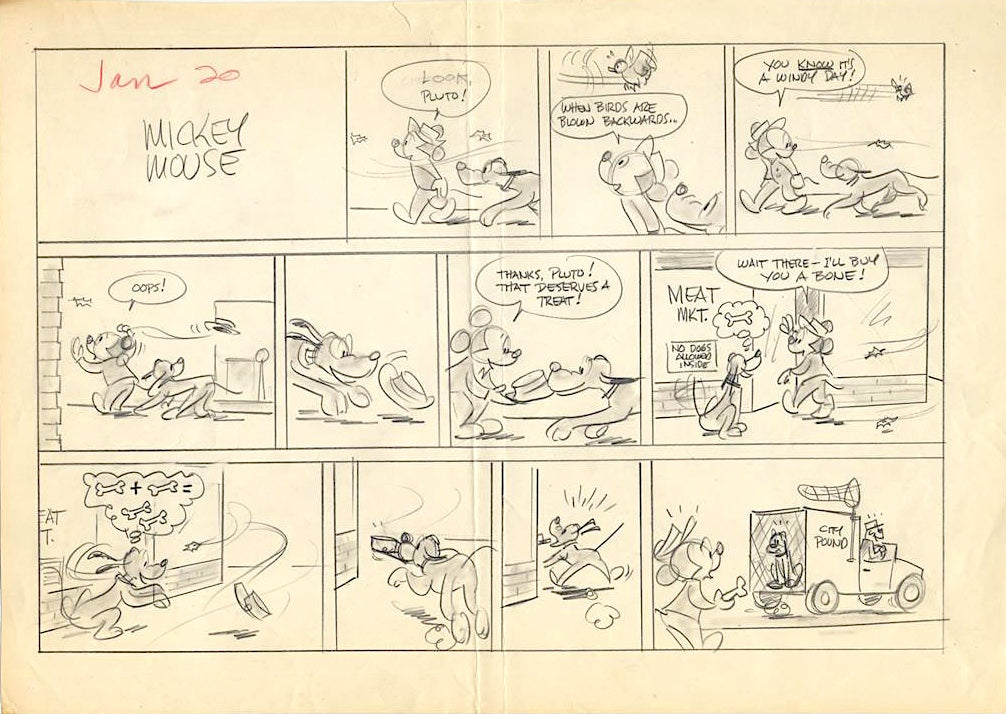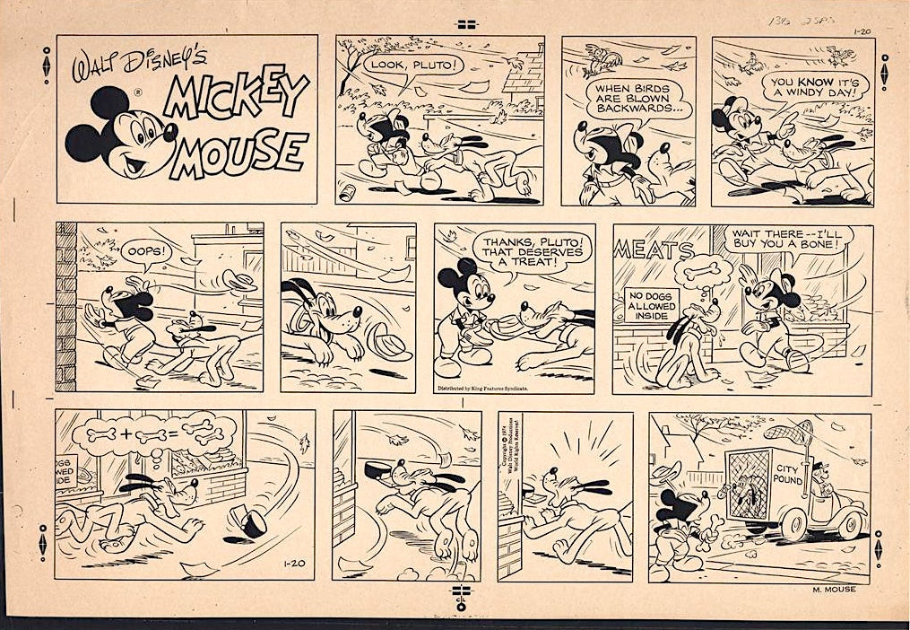 ABOUT THE IMAGE: This is Disney artist-writer Del Connell's polished original drawing in pencil for the Mickey Mouse Sunday page published in newspapers on January 20, 1974 plus the matching black-and-white proof sheet that was issued to newspapers carrying the feature. On a blustery day "when birds are blown backwards" Mickey visits the meat market to buy Pluto a bone, but his beloved pooch ends up in the dog catcher's wagon.