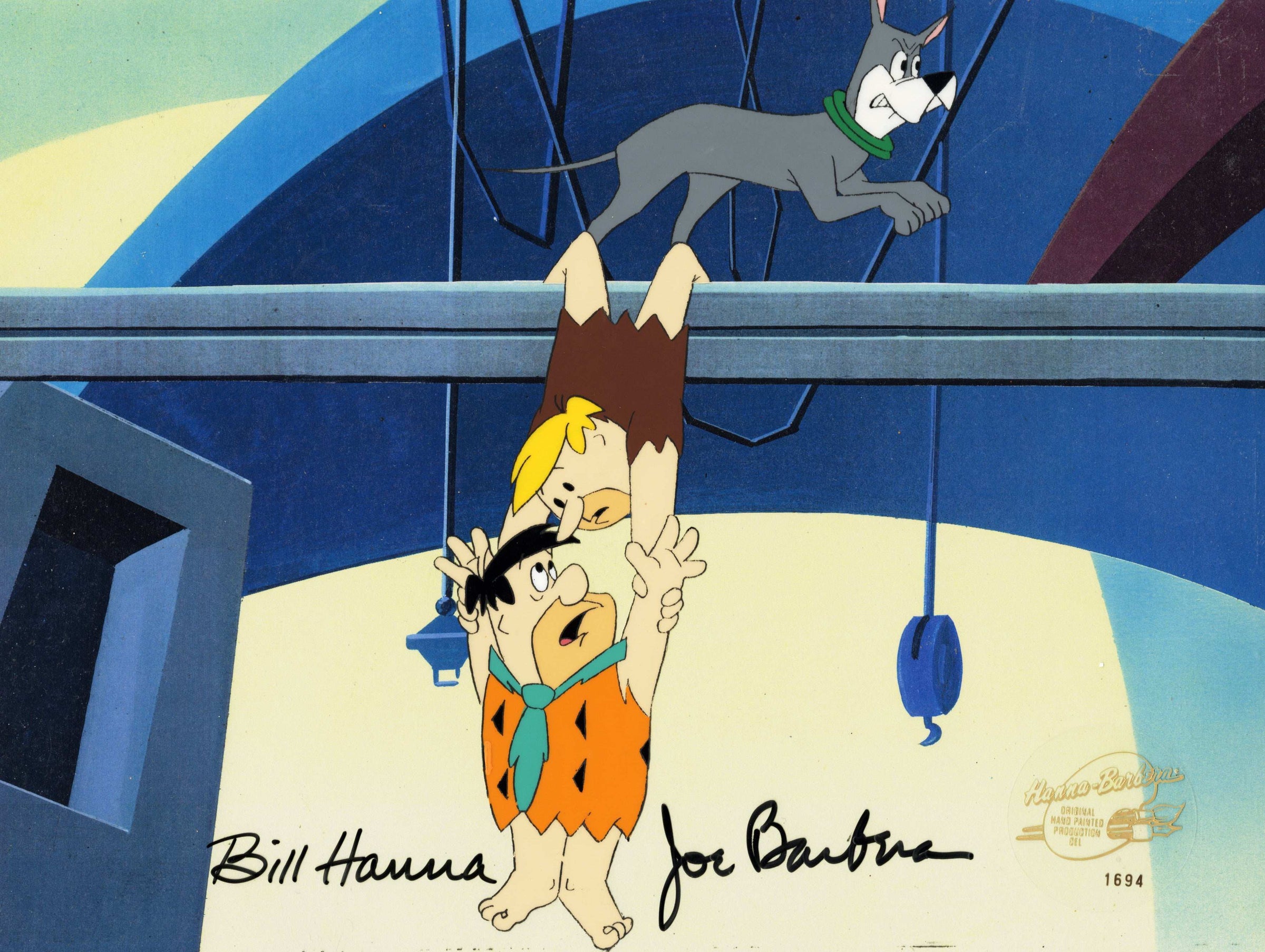 The Jetsons Meet The Flintstones Original Production Cel Signed by Bill Hanna and Joe Barbera: Fred, Barney, Astro
