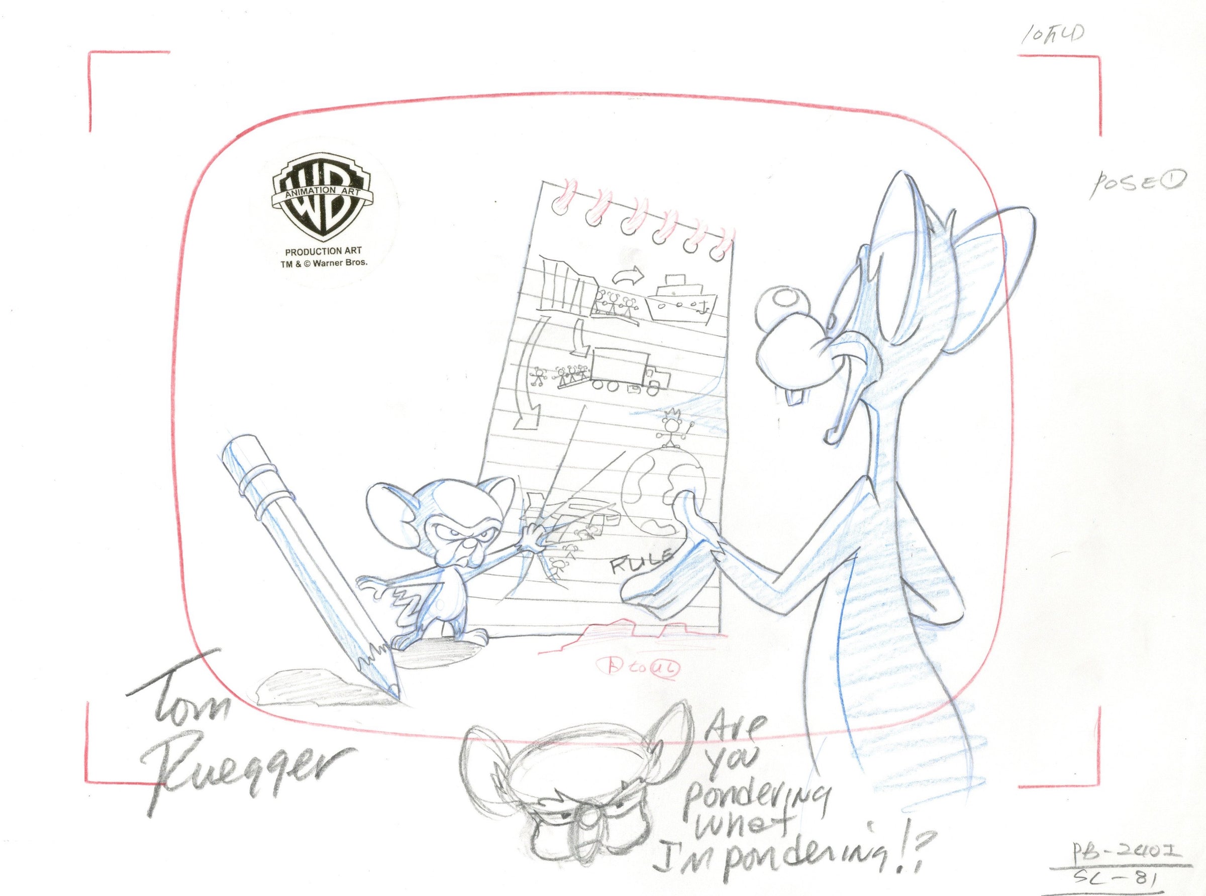 ABOUT THE IMAGE: Pinky and the Brain is a cartoon that follows a self-proclaimed genius, The Brain, and his dimwitted sidekick, Pinky, as they try to conquer the world. Pinky and the Brain was the first animated television series to be presented in Dolby Surround. It was created by Tom Ruegger and the fourth collaboration between Steven Spielberg's production company, Amblin Entertainment and Warner Bros. Animation. The characters first appeared in 1993 as a recurring skit on the show Animaniacs. Thanks to its popularity it was later spun off as a series. There were 66 episodes produced. This piece comes with a certificate of authenticity.