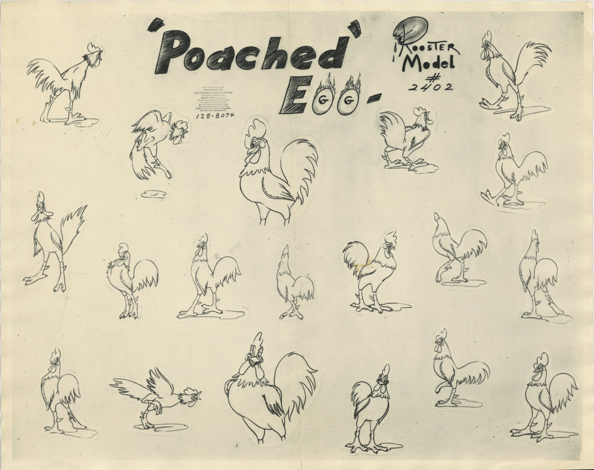 ABOUT THE MEDIUM: Photostat Model Sheets are reference guides used by animators to ensure consistency in character design, proportions, and expressions throughout a film. These printed sheets typically feature multiple poses, facial expressions, and turnarounds of a character, often photocopied from finalized drawings by lead animators. Model sheets help maintain uniformity in animation by providing a standard reference for all artists working on a character, preventing visual discrepancies between different scenes.