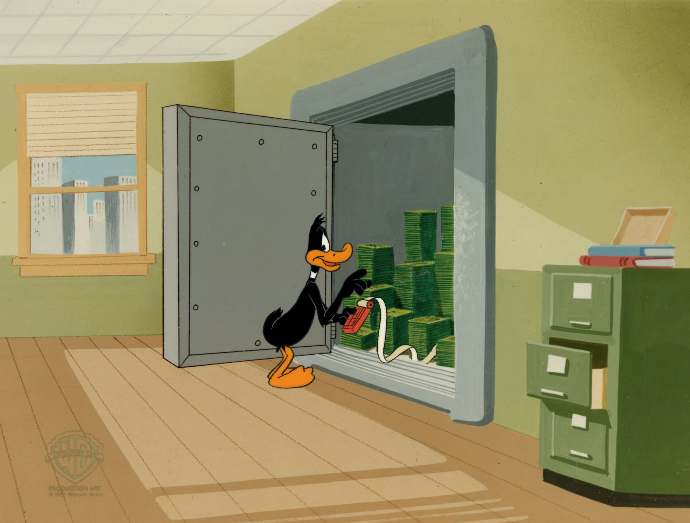 ABOUT THE IMAGE: In the animated feature "Daffy Duck's Quackbusters", wealthy J.P. Cubish has promised his fortune to anyone who can make him laugh. After Cubish dies, Daffy Duck, who won the job of personal court jester, lands the inheritance. The rub is that Cubish has demanded the person who receives his money use the funds for good. Daffy mocks the notion until Cubish's ghost starts haunting him. Determined to be rid of the spirit, Daffy recruits his friends -- Porky Pig, Bugs Bunny and others -- to start a ghost-busting service. This piece comes with a certificate of authenticity.
