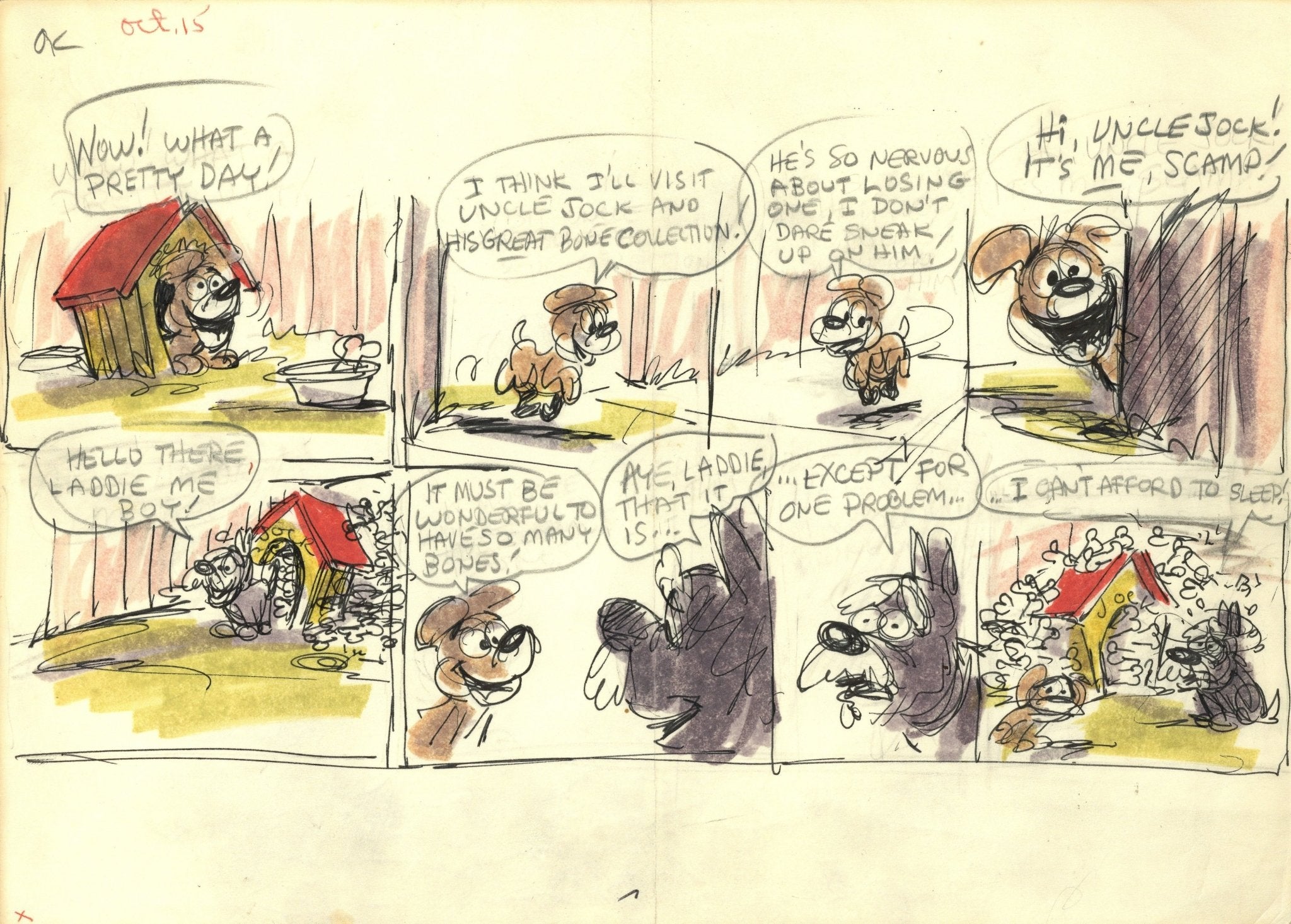 ABOUT THE IMAGE: This is artist-writer Bill Berg's lively original drawing for the Sunday comics episode published October 15th, 1978 with a copy of the black and white printed proof of the final version issued by King Features Syndicate to subscribing newspapers. This episode has tramp visitng "Uncle Jock" and his "great bone collection." The Scottish Terrier Jock featured prominently in the film Lady and the Tramp (1955) as Lady's neighbor and close friend. He and Trusty, the bloodhound, made rare appearances in the comic strip. "Oct. 15th" is written in red pencil and editor's "OK" in black in the top margin at left.