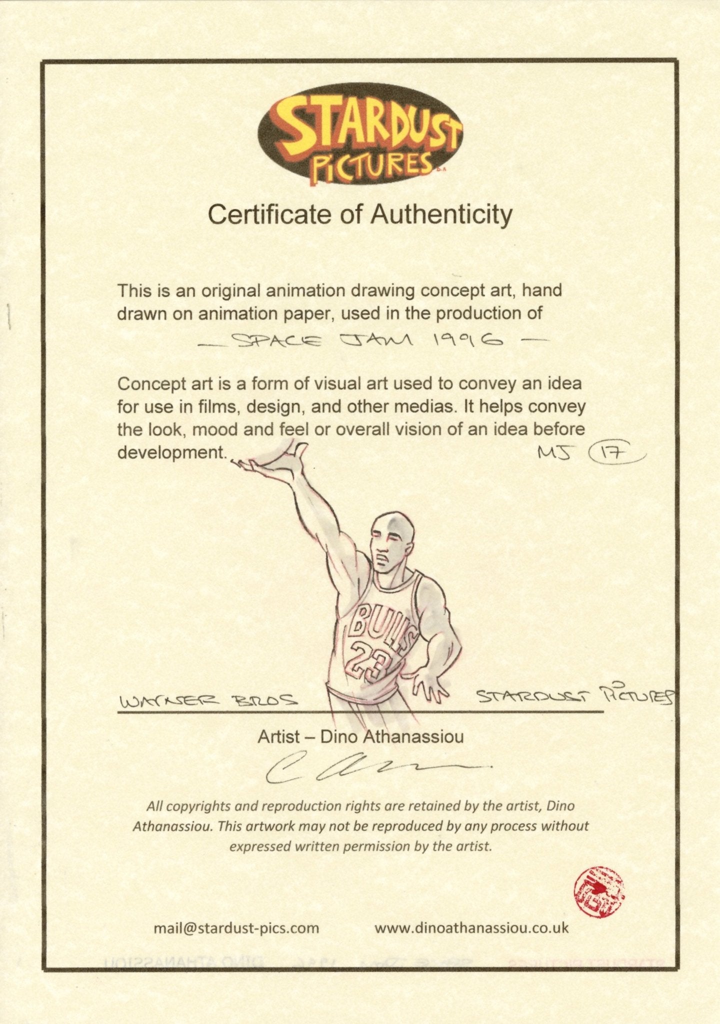 Signed by the artist, Dino Athanassiou, and accompanied by a Certificate of Authenticity from Stardust, this drawing represents a unique collectible. It captures the spirit of Space Jam, celebrating its blend of live-action and animation in a way that appeals to art collectors and film enthusiasts alike.
