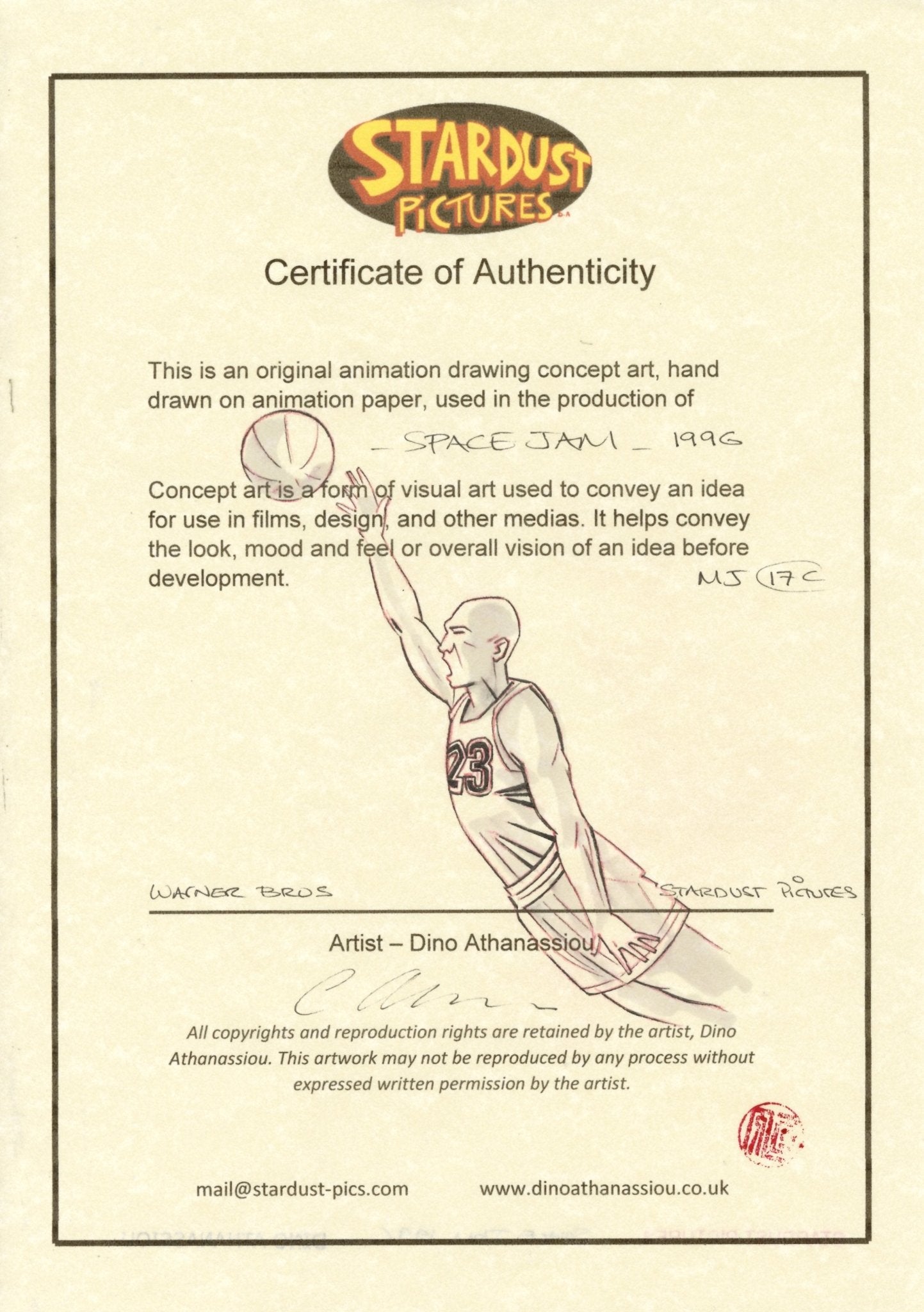 Signed by the artist, Dino Athanassiou, and accompanied by a Certificate of Authenticity from Stardust, this drawing represents a unique collectible. It captures the spirit of Space Jam, celebrating its blend of live-action and animation in a way that appeals to art collectors and film enthusiasts alike.