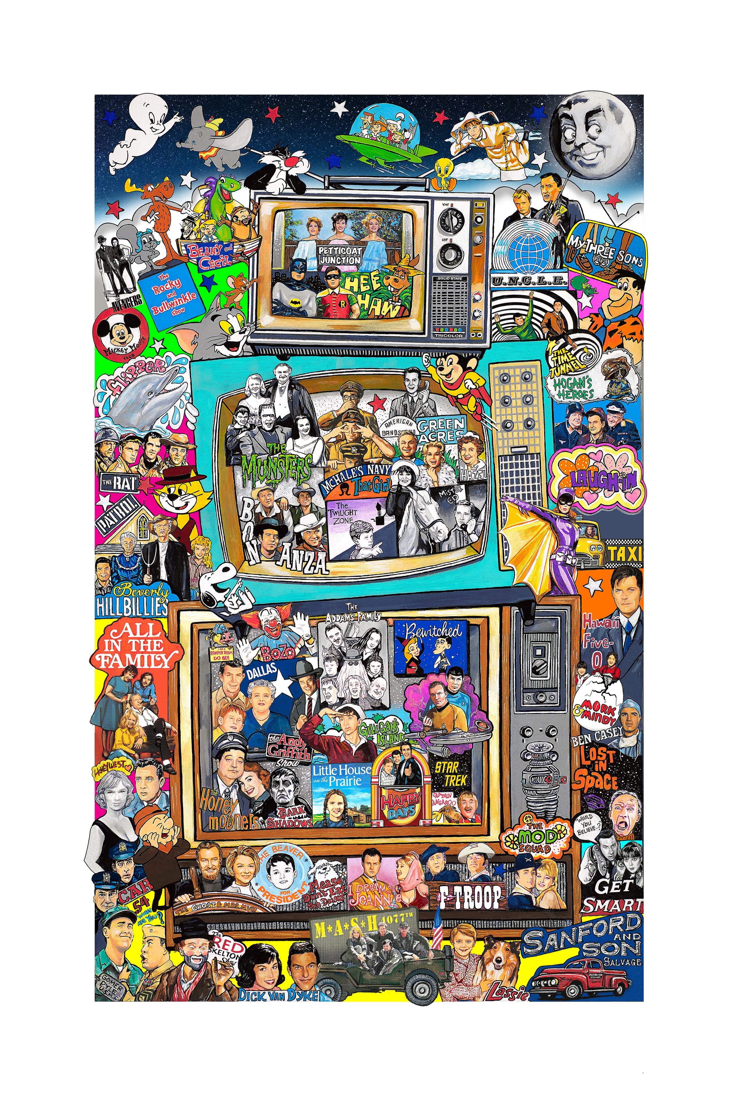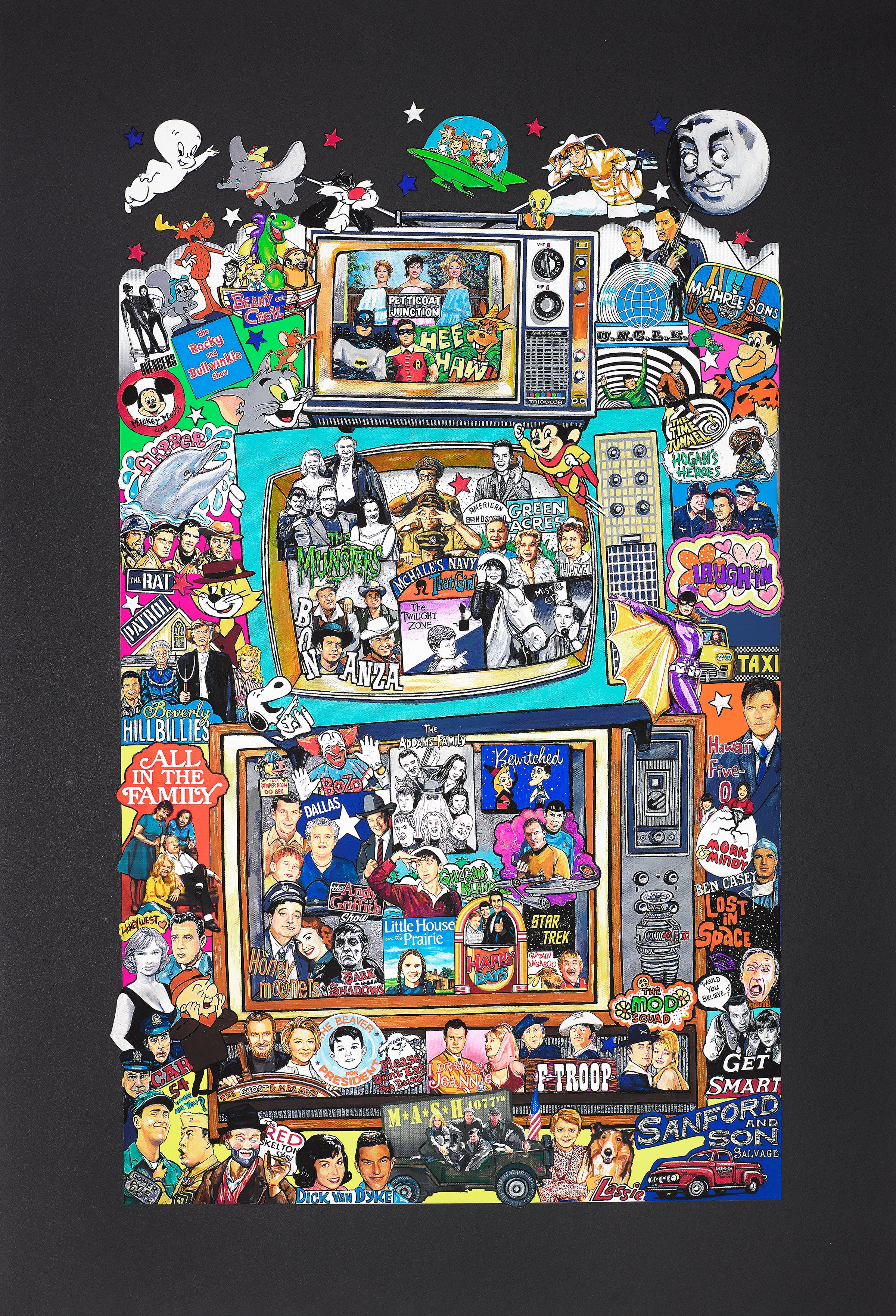 ABOUT THE IMAGE: Tune in to your favorite classic T.V. shows from the 1950s – 70s with Fazzino’s “Timeless Memories of T.V.” From The Flintstones and The Jetsons, to Gilligan’s Island and  M*A*S*H, this  limited edition is stacked with dozens of beloved cartoons, sitcoms, and more! This piece is a hybrid, using both giclee and silk-screen serigraph printing practices. This piece is available in the following background colors of your choice: Black and White