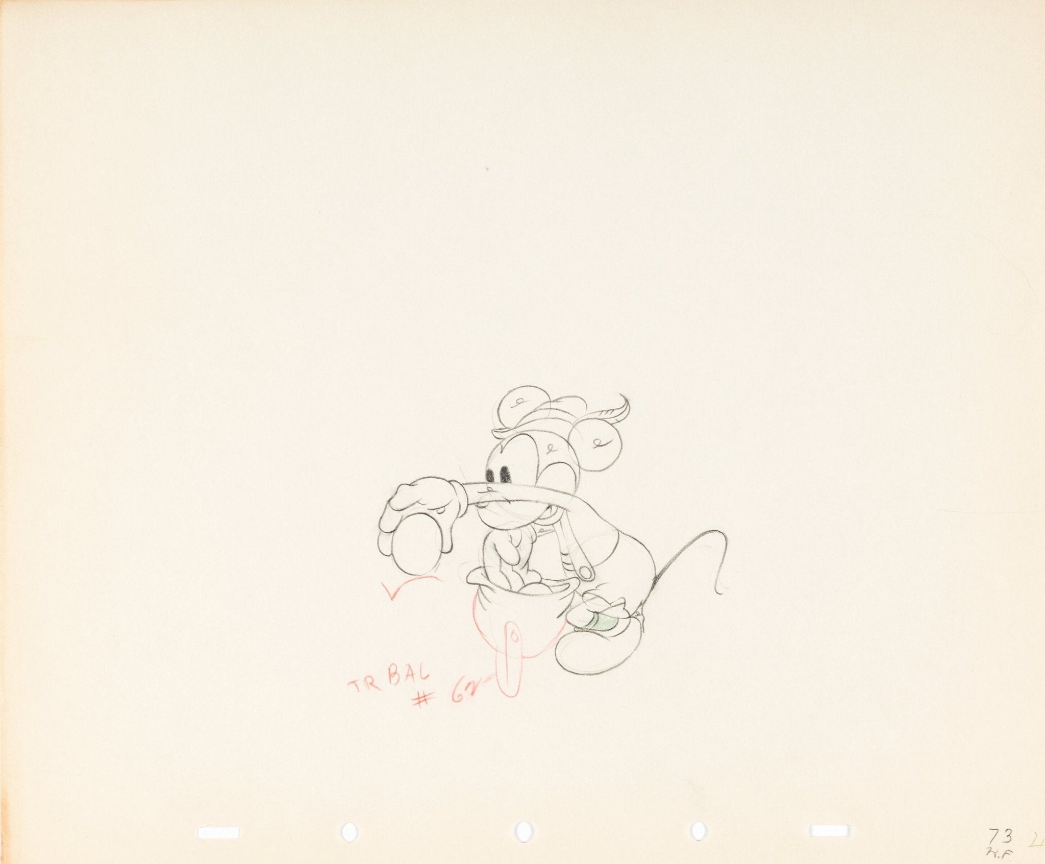 ABOUT THE IMAGE: Mickey, Donald, and Pluto trek through the beautiful but frigid Swiss Alps in search of eagle eggs in Alpine Climbers, directed by Dave Hand and released to theaters on 7/25/1936. The group gets more than they bargained for when Pluto nearly freezes to death and the furious mother eagle catches Mickey in the act! You can find the expressive 12 field 5-peghole graphite with color pencil animation drawing featuring a full figure Mickey Mouse, starting at about 2:12 in the short as Mickey realizes the mother eagle is watching him take her eggs. He tries to backpedal and laughs nervously while holding up one of her eggs, but that does nothing to calm her down. The animation drawing measures about 4'' x 3.25'' and is numbered 73 in the lower right corner of the page.