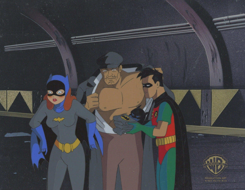 ABOUT THE IMAGE: In the episode Shadow of the Bat Part II, Batman has been captured by Two-Face and his gang, leaving Robin to do the investigation behind Commissioner Gordon's framing. However, Robin will find an unusual partner in Batgirl, who is also on the path to clear her father's name and the information she has uncovered about acting commissioner Gil Mason will help them on their quest. This piece comes with a certificate of authenticity.
