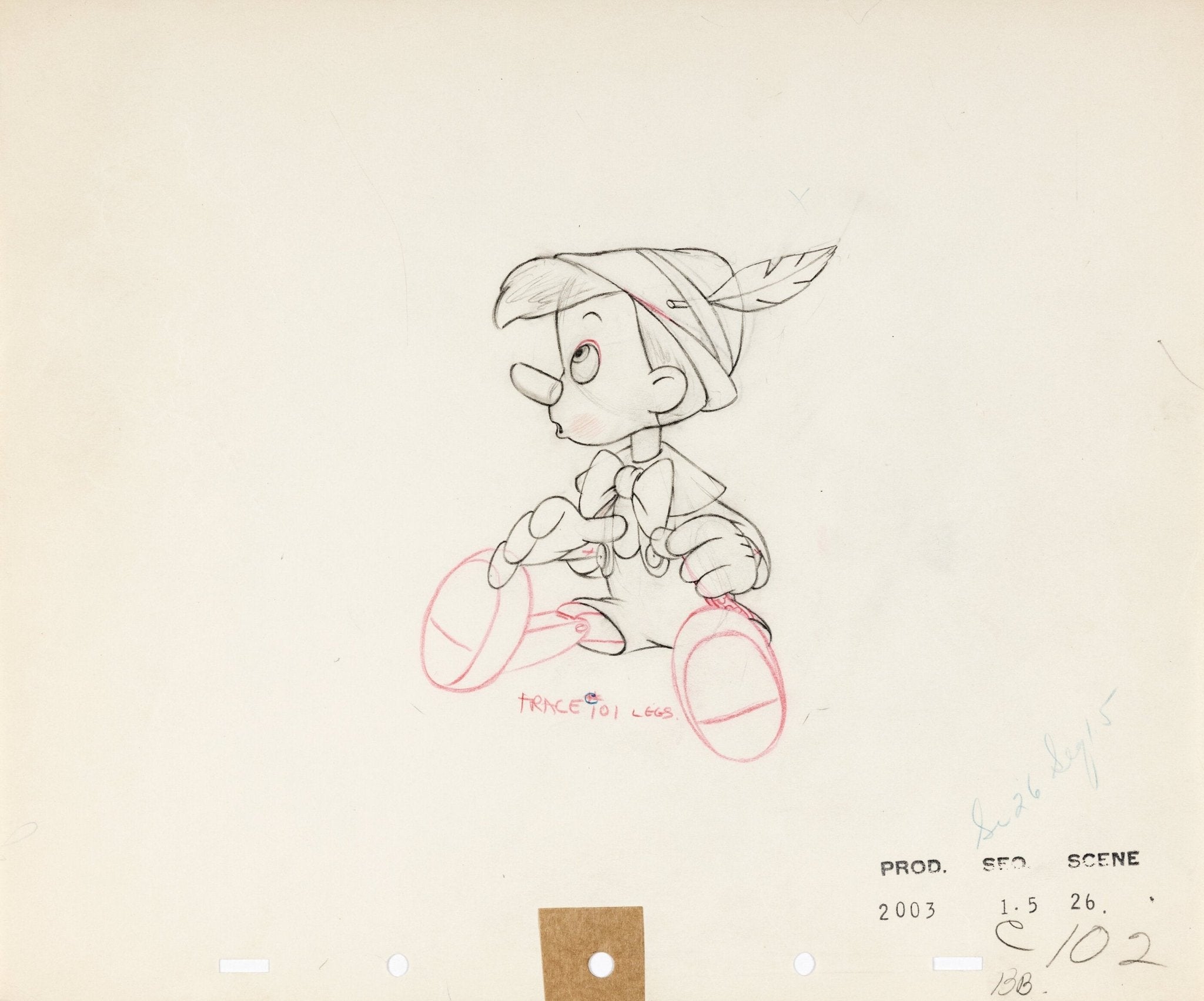 ABOUT THE IMAGE: "I can move! I can talk!" Pinocchio is granted life in this fantastic original animation drawing from Walt Disney's timeless classic Pinocchio. Created for the moment seen at 16:26 mark of the film, this 12 field 5-peghole drawing is rendered expertly in graphite and color pencil. Pinocchio measures a centered 5" tall on the drawing, and the piece bears an official Walt Disney stamp with the production, sequence, and scene numbers 2003, 1.5, and 26. The drawing also bears the handwritten frame number C102. A great image of Pinocchio from his first scenes of life!
