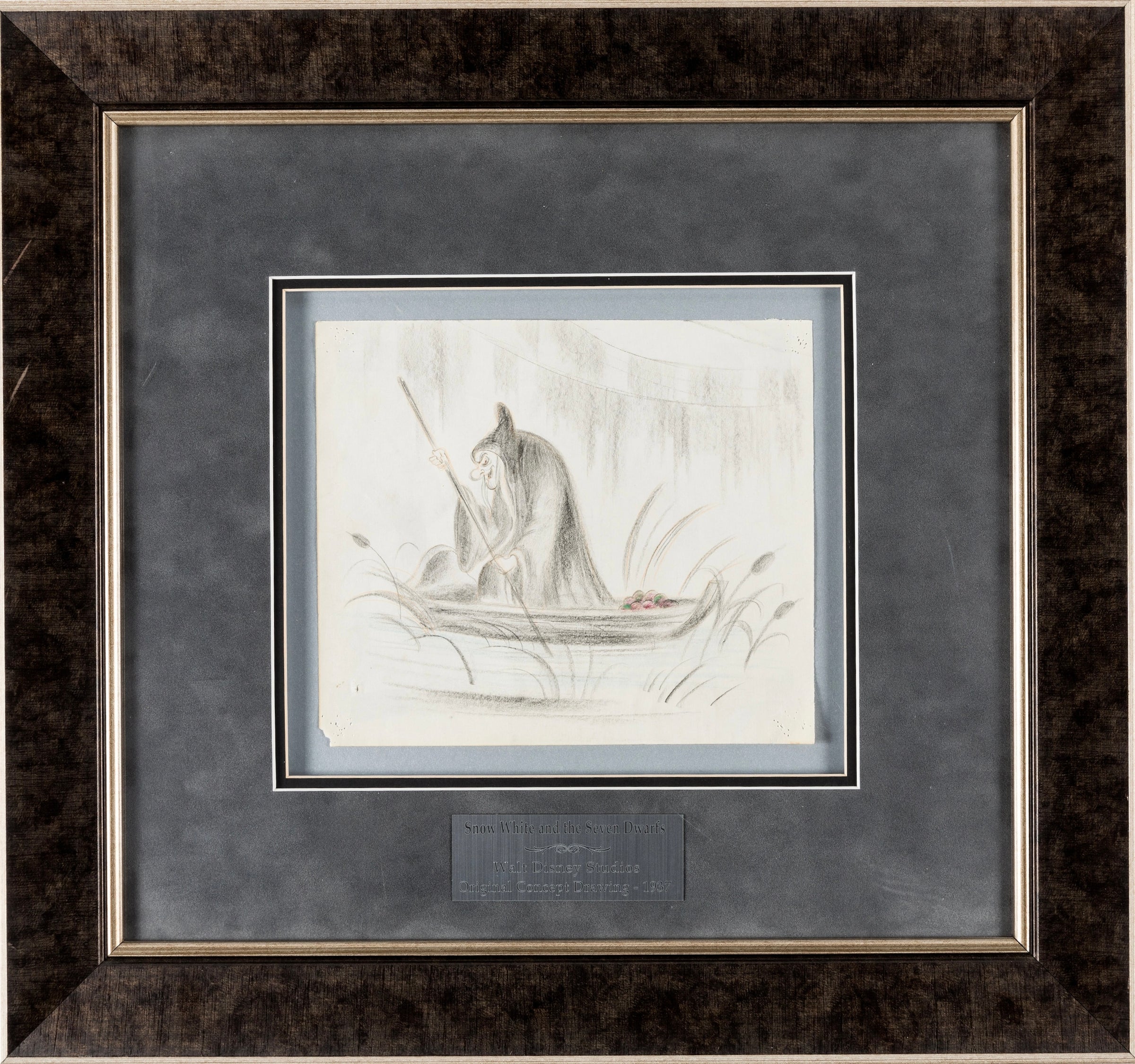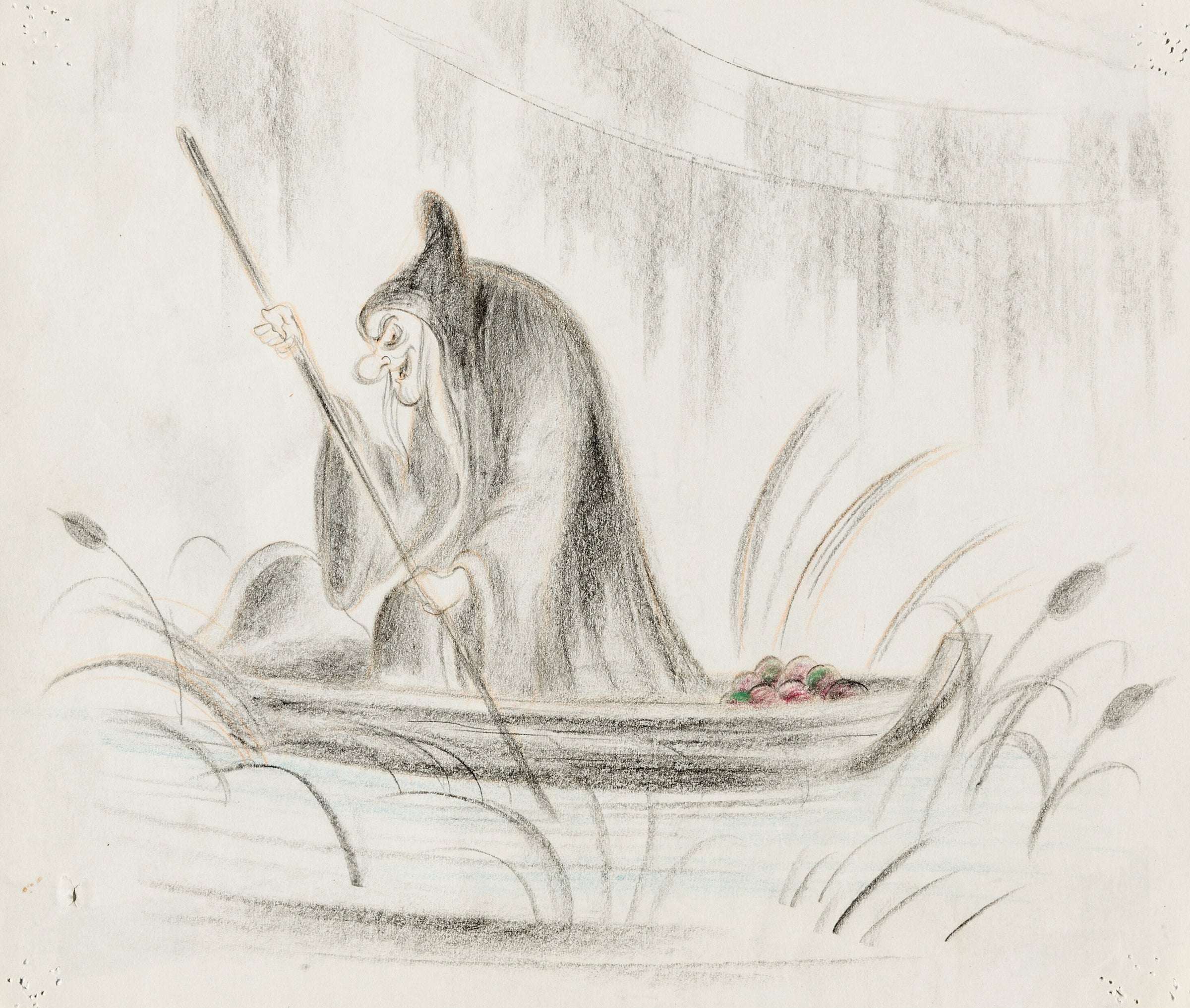 ABOUT THE IMAGE: The Old Hag sets off for the dwarfs' cottage in her boat, her basket with the poison apple sitting close by. This rare storyboard captures the moment at about 1:05:15 as she pushes the boat through the reeds, a wicked smile on her face. Each concept and storyboard was incredibly important to the filmmaking process, especially during the making of Disney's first animated feature when the process was still new and was being refined for pre-production. It helped to establish the look, framing, movement, and positioning of a character in a scene, and this made the process smoother for animators later on.