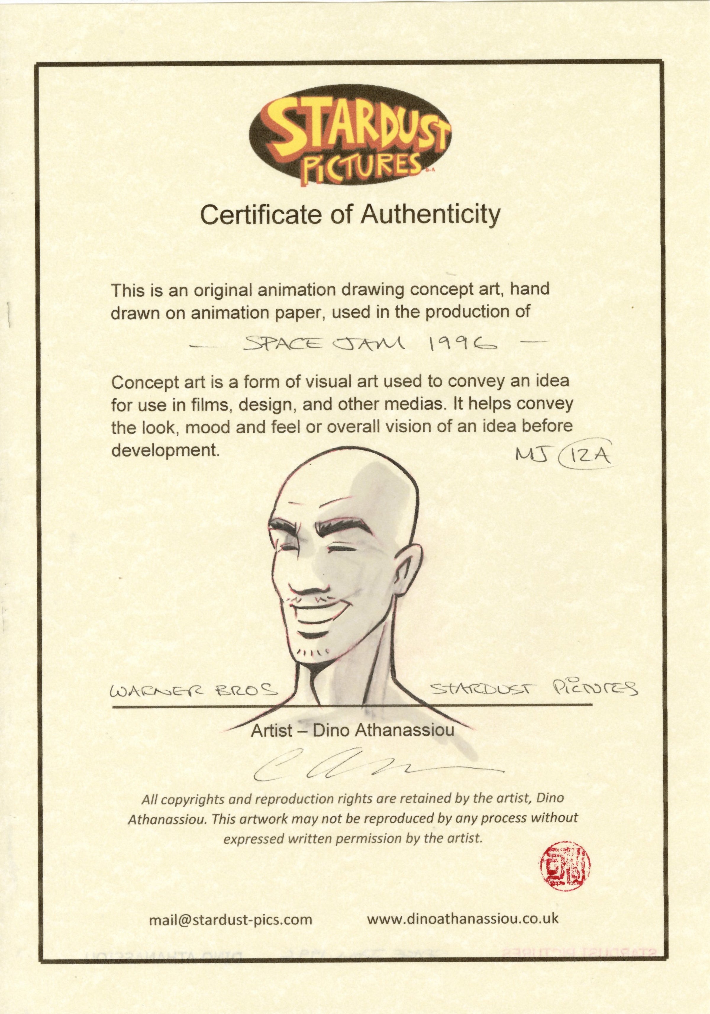 Signed by the artist, Dino Athanassiou, and accompanied by a Certificate of Authenticity from Stardust, this drawing represents a unique collectible. It captures the spirit of Space Jam, celebrating its blend of live-action and animation in a way that appeals to art collectors and film enthusiasts alike.