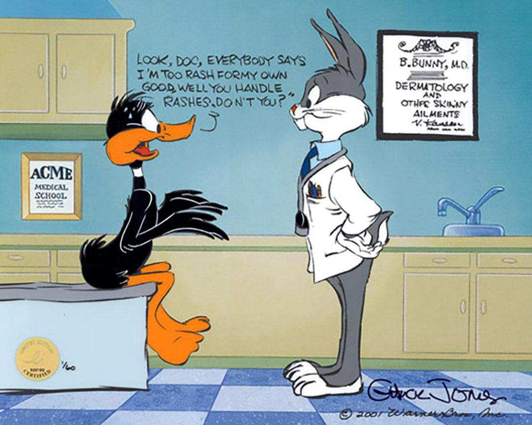 ABOUT THE IMAGE: An image of Daffy Duck consulting with Bugs Bunny, who is acting and dressed as a doctor. Daffy, as the patient, is asking, “Look, Doc, everybody says that I am too rash for my own good. Well, you handle rashes, don’t you?”