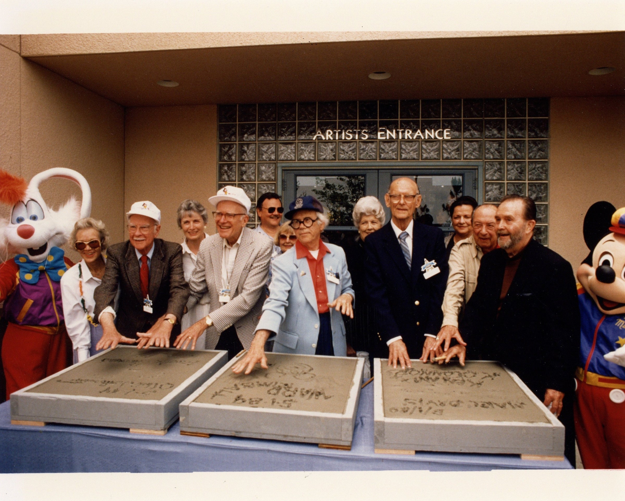 ABOUT THE IMAGE: This photo showcases the opening day of Disney/MGM studio park in Orlando. Here Ollie Johnston, Frank Thomas, Ward Kimball, Ken O'Connor and Marc Davis personalize cement blocks by leaving their handprints on them. The entrance to the Feature Animation Building can be seen in the background.
