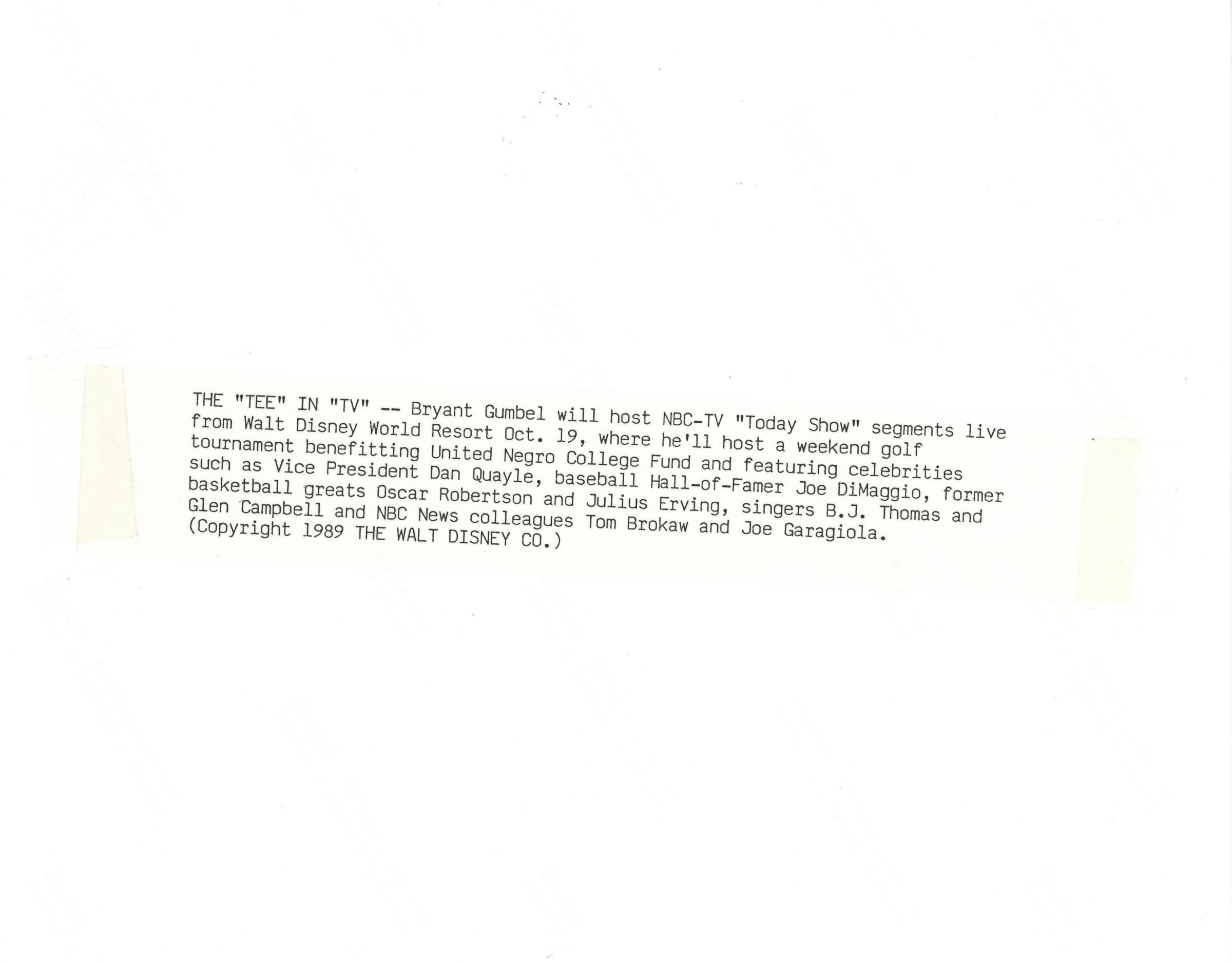 ABOUT THE IMAGE: "THE "TEE" IN "TV" -- Bryant Gumbel will host NBC-TV "Today Show" segments live from Walt Disney World Resort Oct. 19, where he'll host a weekend golf tournament benefitting United Negro College Fund and featuring celebrities such as Vice President Dan Quayle, baseball Hall-of-Famer Joe DiMaggio, former basketball greats Oscar Robertson and Julius Erving, singers B.J. Thomas and Glen Campbell and NBC News colleagues Tom Brokaw and Joe Garagiola."