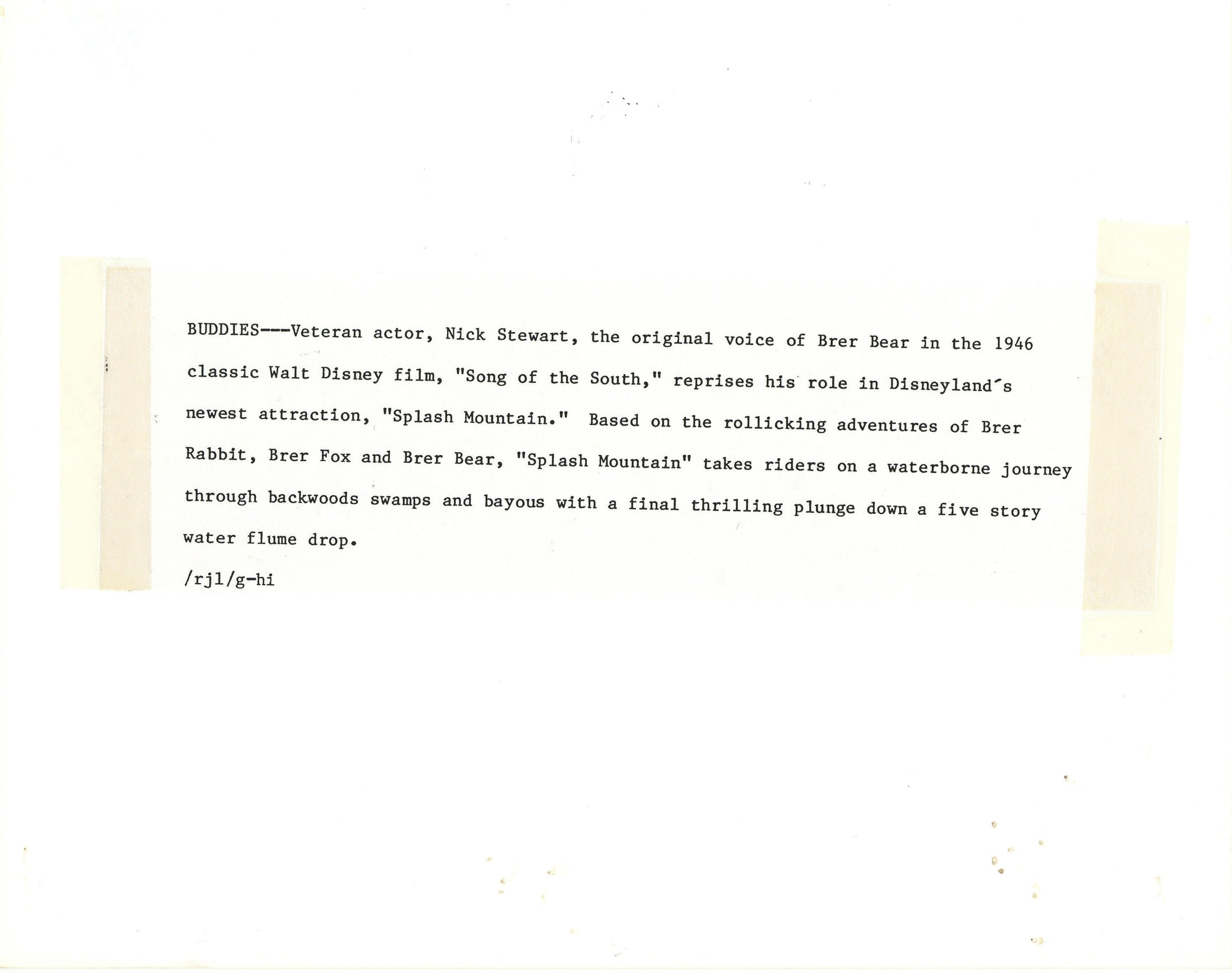 ABOUT THE IMAGE: "BUDDIES--Veteran actor, Nick Stewart, the original voice of Br'er Bear in the 1946 classic Walt Disney film, "Song of the South," reprises his role in Disneyland's