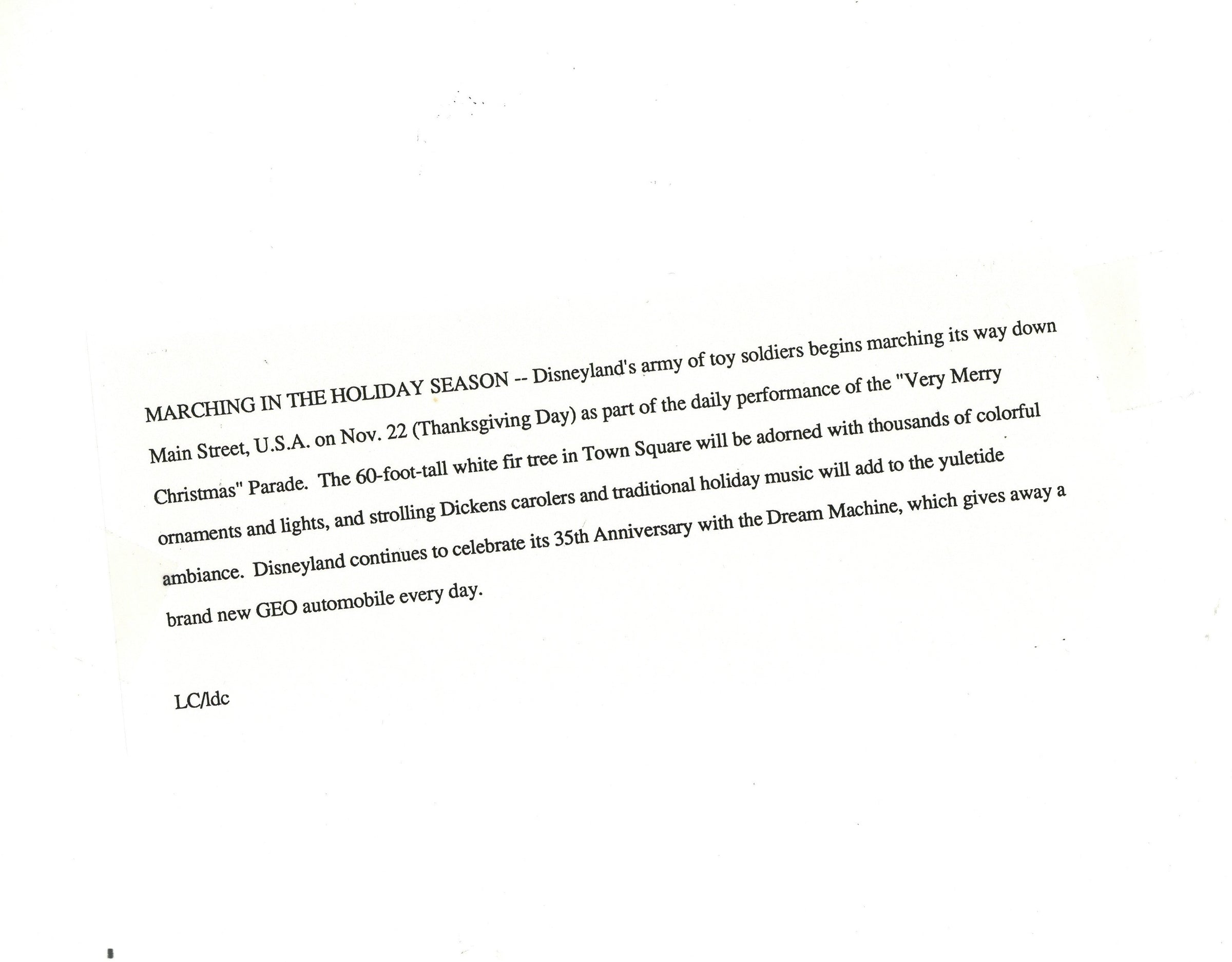 ABOUT THE IMAGE: "MARCHING IN THE HOLIDAY SEASON -- Disneyland's army of toy soldiers begins marching its way down Main Street, U.S.A. on Nov. 22 (Thanksgiving Day) as part of the daily performance of the "Very Merry Christmas" Parade. The 60-foot-tall white fir tree in Town Square will be adorned with thousands of colorful ornaments and lights, and strolling Dickens carolers and traditional holiday music will add to the yuletide ambiance. Disneyland continues to celebrate its 35th Anniversary with the Dream Machine, which gives away a brand new GEO automobile every day."