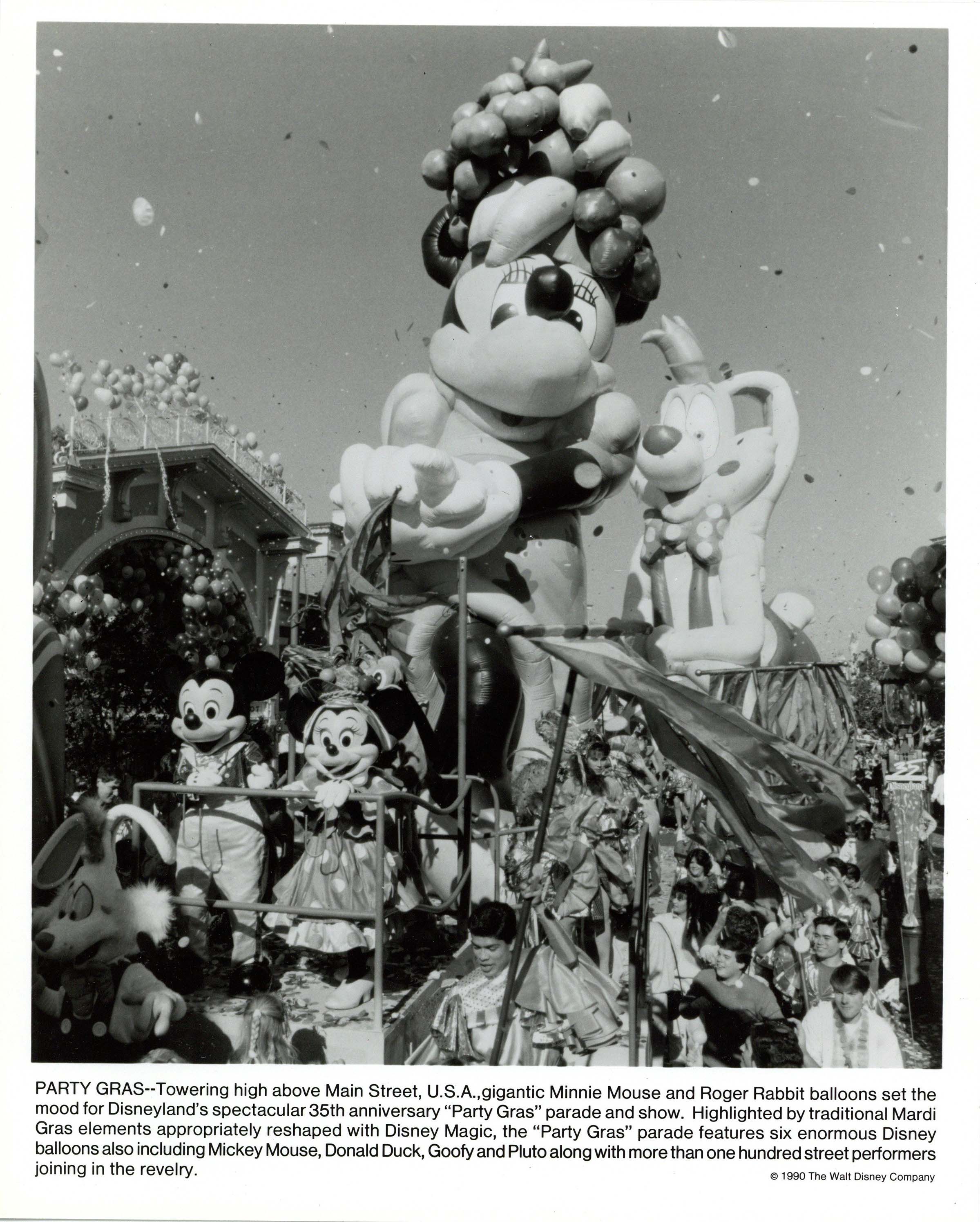 ABOUT THE IMAGE: "PARTY GRAS--Towering high above Main Street, U.S.A.,gigantic Minnie Mouse and Roger Rabbit balloons set the mood for Disneyland's spectacular 35th anniversary "Party Gras" parade and show. Highlighted by traditional Mardi Gras elements appropriately reshaped with Disney Magic, the "Party Gras" parade features six enormous Disney balloons also including Mickey Mouse, Donald Duck, Goofy and Pluto along with more than one hundred street performers joining in the revelry."