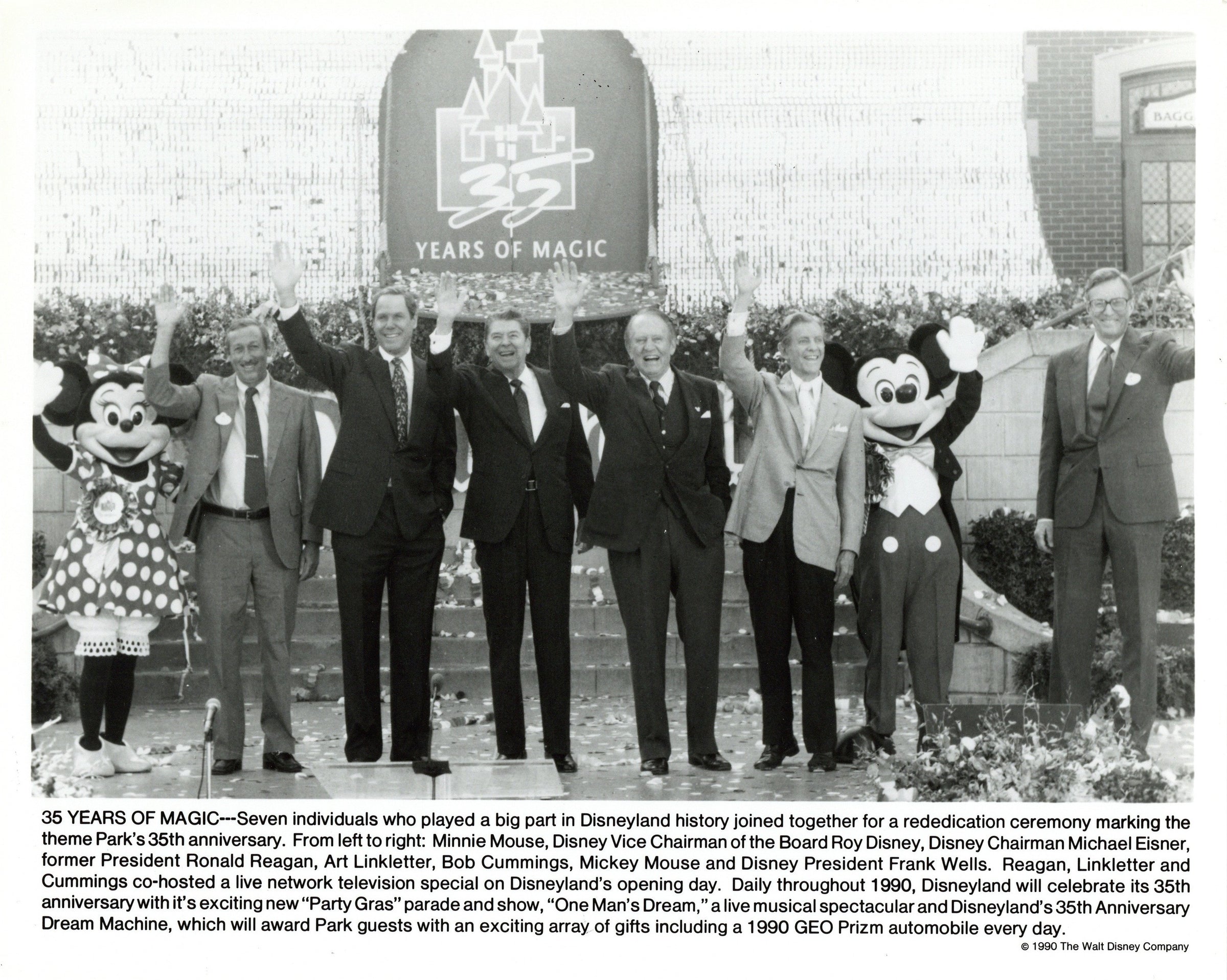 ABOUT THE IMAGE: 35 YEARS OF MAGIC - Seven individuals who played a big part in Disneyland history joined together for a rededication ceremony marking the theme Park's 35th anniversary. From left to right: Minnie Mouse, Disney Vice Chairman of the Board Roy Disney, Disney Chairman Michael Eisner, former President Ronald Reagan, Art Linkletter, Bob Cummings, Mickey Mouse, and Disney President Frank Wells.