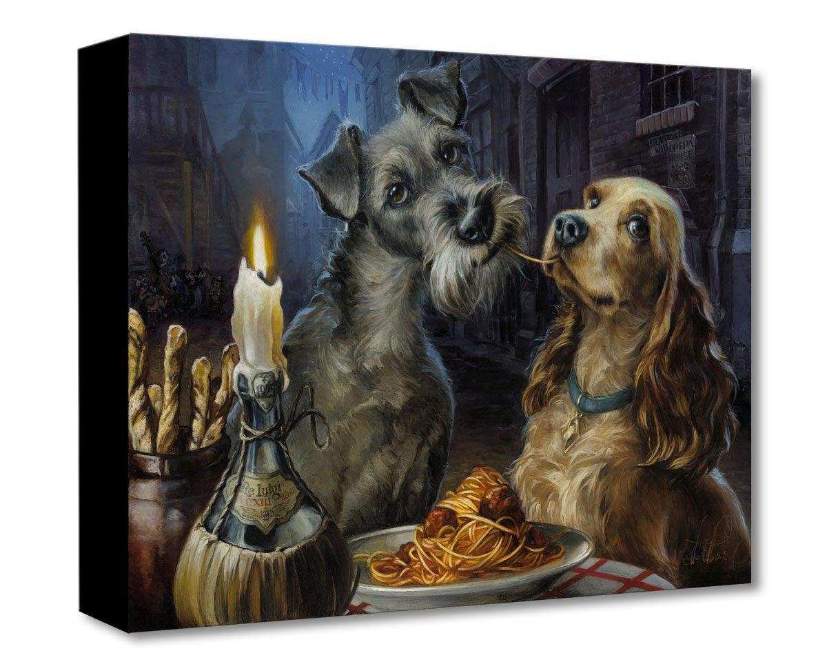 ABOUT THE IMAGE: Inspired by Walt Disney’s Animated 1955 Film Lady and the Tramp. Lady and Tramp, as reimagined by artist Heather Edwards, share a romantic evening together, and a famous bowl of spaghetti, in this visual retelling of the most enduring scene from Disney's classic film.