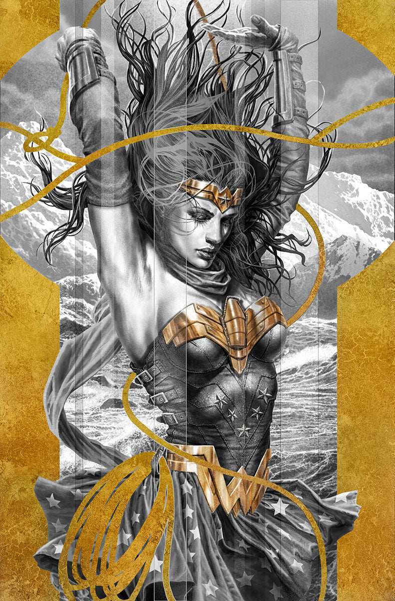 DESCRIPTION: This image was used for the cover of Wonder Woman Black and Gold #6. Each piece is hand-numbered, signed, and remarked by Lee Bermejo.