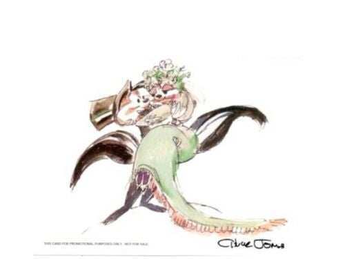 ABOUT THE IMAGE: Pepe La Pew dressed in a top hat holding his bride, who is wearing a green dress and green flowers in her hair.
