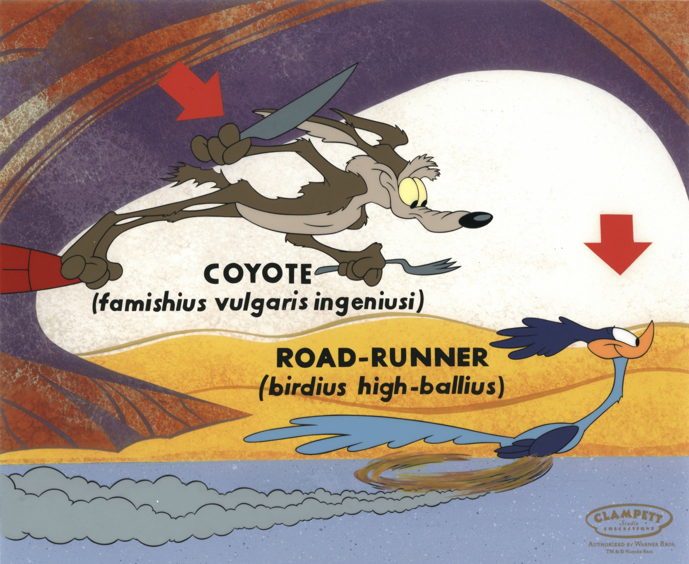 ABOUT THE IMAGE:  A typical pose for a typical Famishius Vulgaris Ingeniusi as he attempts the knifing and forking of his Birdius High-Ballius, albeit, Road Runner lunch.  It isn’t often that characters without dialogue can be so strongly understood. But with Chuck Jones’ creation of Wile E. Coyote and the Road Runner, their action and body movements, and yes, a couple of now-and-then signs, still manages to speak volumes.