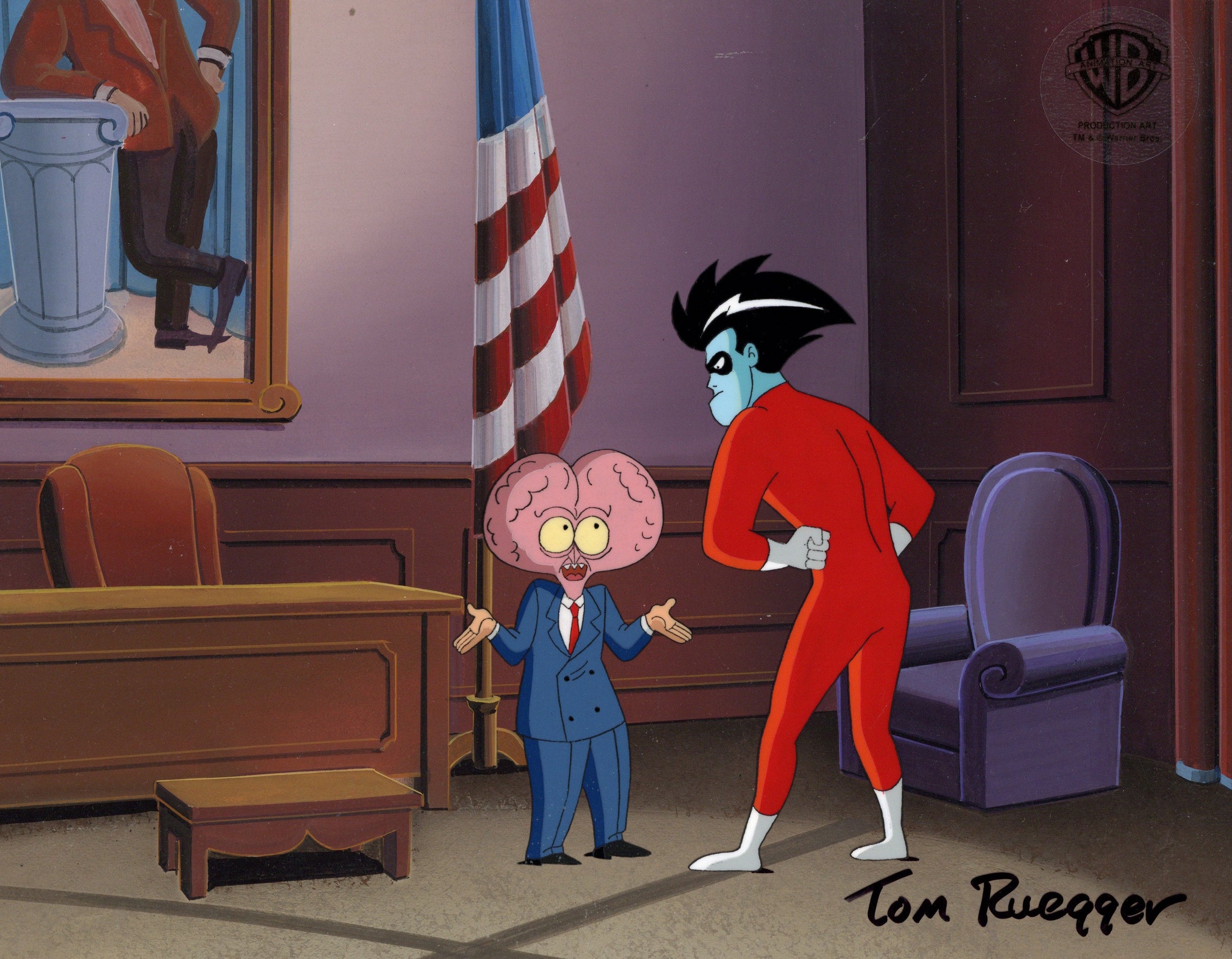 ABOUT THE IMAGE: Freakazoid! is an American superhero animated television series created by Bruce Timm and Paul Dini and developed by Tom Ruegger for the Kids' WB programming block of The WB. The series chronicles the adventures of the title character, Freakazoid, a crazy superhero who battles with an array of supervillains. The show also features mini-episodes of adventures of other bizarre superheroes. The show was produced by Amblin Entertainment and Warner Bros. Animation. The cartoon was the third animated series produced by the collaboration of Steven Spielberg and Warner Bros. Animation during the animation renaissance of the 1990s. This piece comes with a certificate of authenticity.