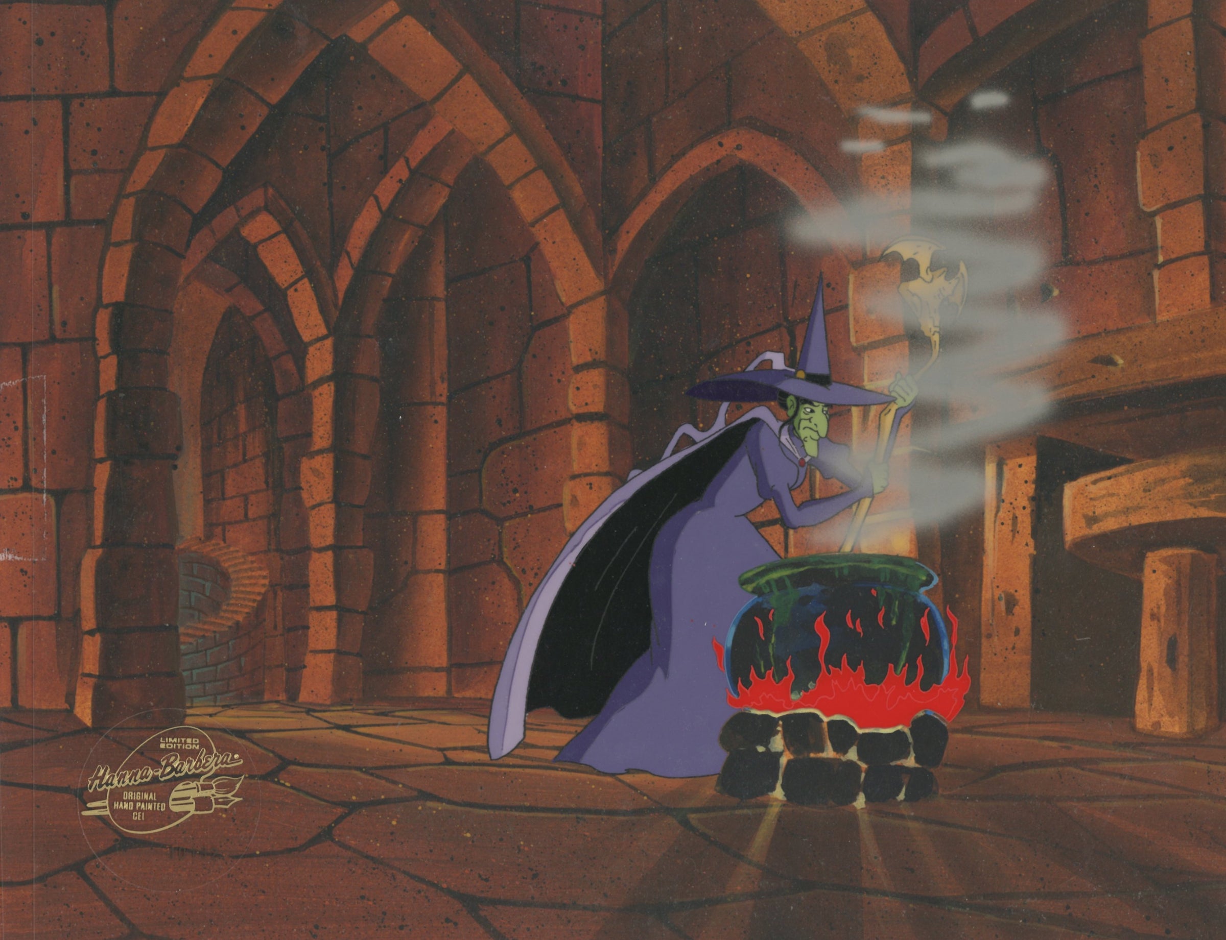 ABOUT THE MEDIUM: Original production cels are one-of-a-kind pieces of art that were used in the creation of an animated film or television show. Each has been hand-painted by studio artists on a piece of celluloid acetate, and has been photographed over a background painting to create a frame of the finished production.