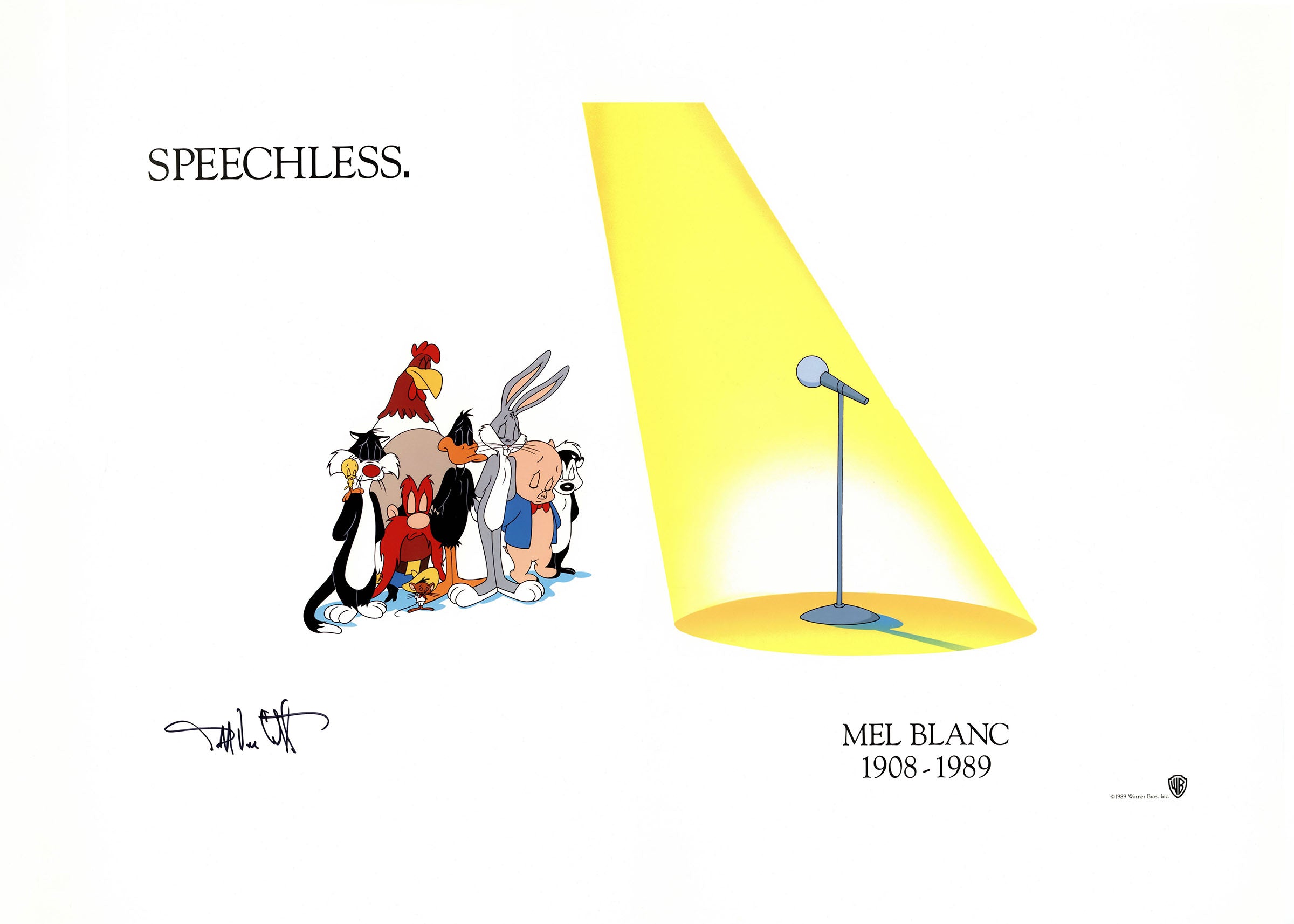 ABOUT THE IMAGE:  This open edition lithograph pays tribute to the incomparable voice talent of Mel Blanc, who brought to life many of the Looney Tunes characters. Created from an original illustration by Warner Brothers Artists for use in trade publications after Mel Blanc passed away, the Speechless image serves as a reminder of the remarkable talent of this legendary performer.