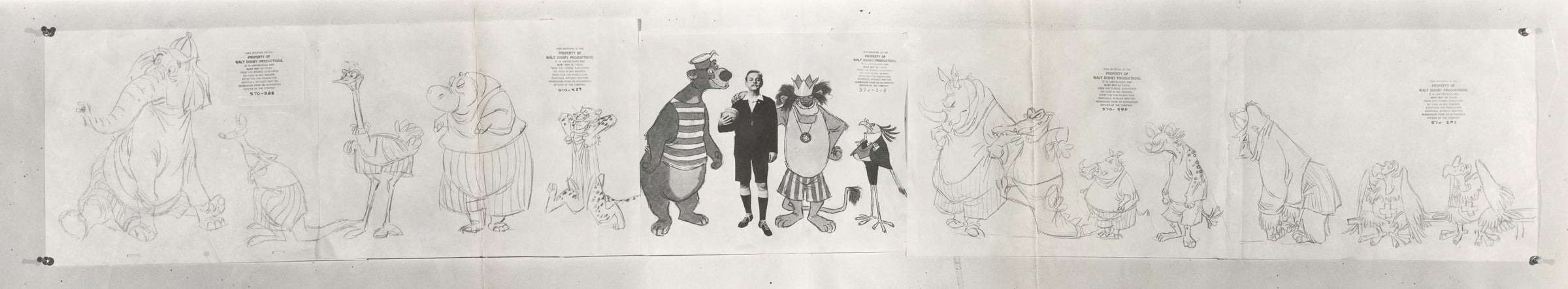 ABOUT THE MEDIUM: Photostat Model Sheets are reference guides used by animators to ensure consistency in character design, proportions, and expressions throughout a film. These printed sheets typically feature multiple poses, facial expressions, and turnarounds of a character, often photocopied from finalized drawings by lead animators. Model sheets help maintain uniformity in animation by providing a standard reference for all artists working on a character, preventing visual discrepancies between different scenes.