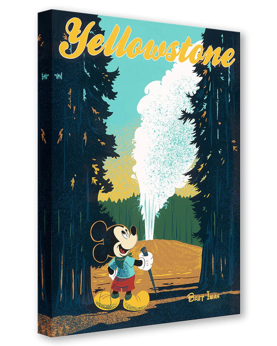 ABOUT THE IMAGE: Inspired by vintage travel posters, this limited-edition giclée canvas print shows Mickey taking a stroll through Yellowstone Park's giant Redwood Forest, experiencing the marvel at a volcano’s hidden power rising up in colorful hot springs, mud pots, and geysers. This special artwork is gallery wrapped and ready to hang so you can start dreaming of your next (or first) excursion to one of our great National Parks.