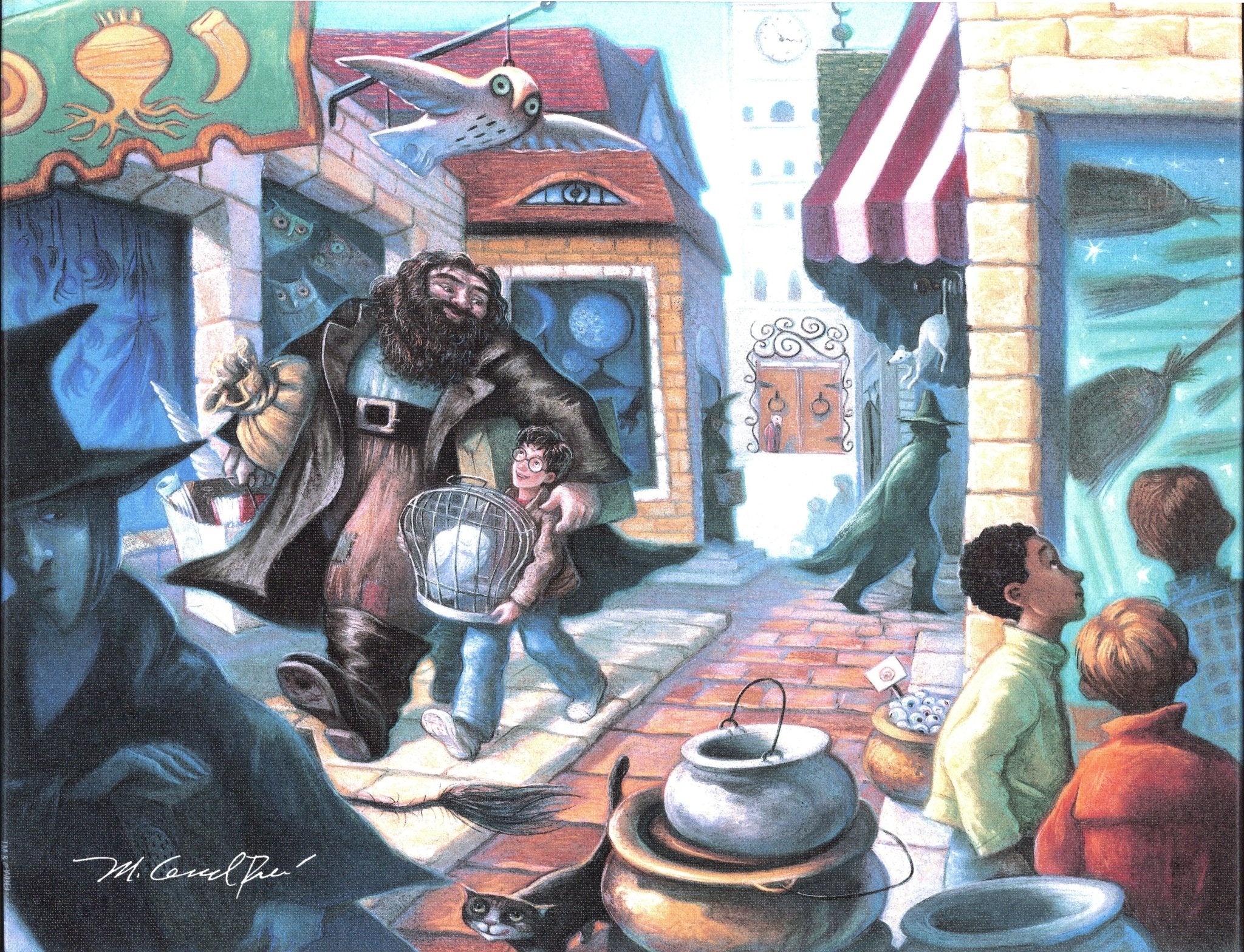 ABOUT THE IMAGE: Diagon Alley was rendered and painted by Mary GrandPré, who has created the original artwork that appears on the cover of the Harry Potter book series, and at the beginning of each chapter. Each print is numbered and is hand-signed by the artist.